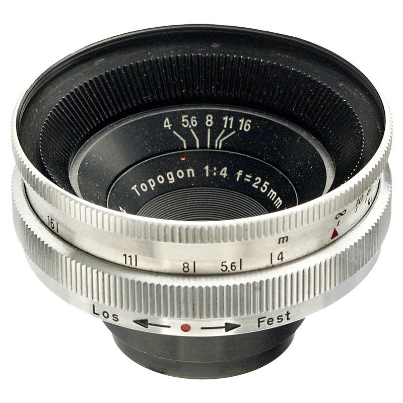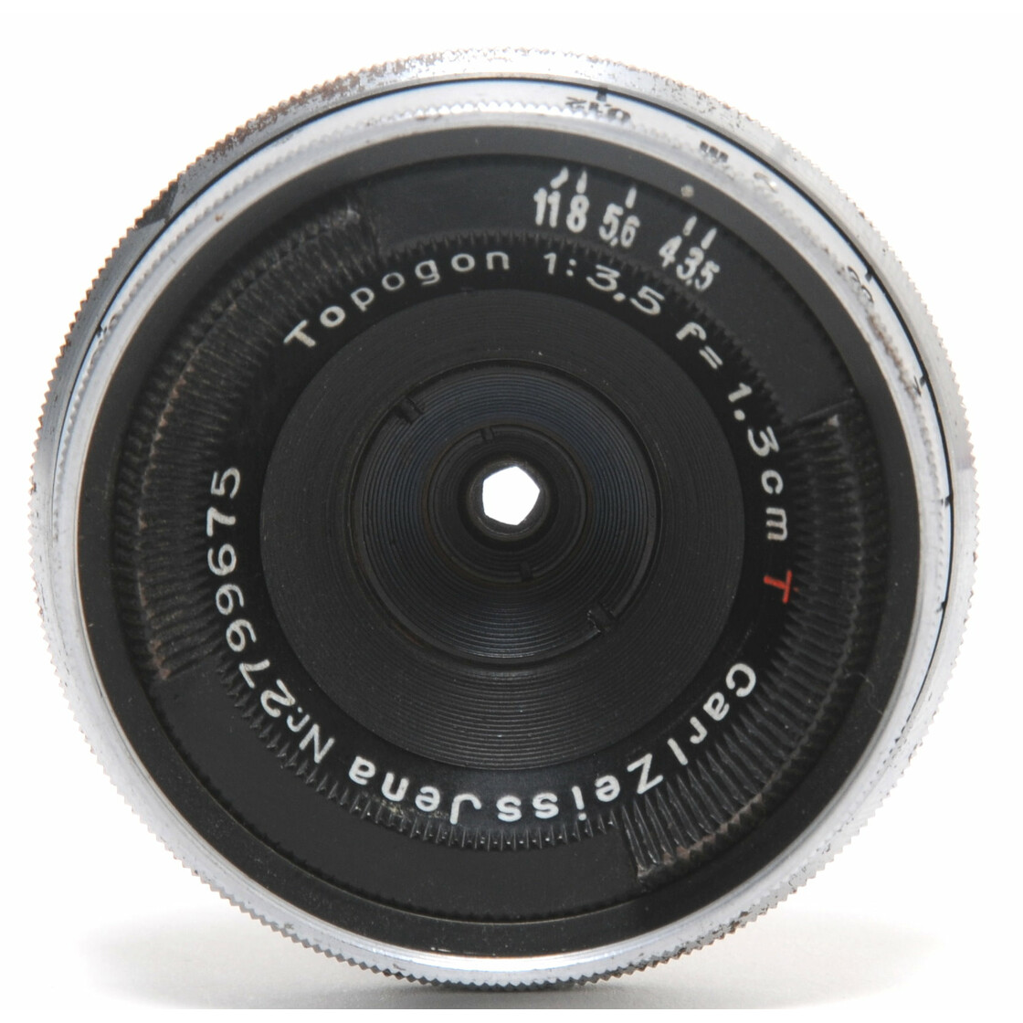 35mm 소형 필름 규격의 대칭형 광각렌즈인 토포곤은 왜곡이 극히 적은 초광각렌즈의 시작점으로 평가됩니다. 대칭형 광학식의 가장 큰 특징이자 장점은 왜곡이 거의 없고 낮은 시야곡률(상면만곡)을 지닌다는 것입니다. 이러한 특징으로 인해 토포곤은 항공 관측(측량)과 같은 특수 목적에 활용되었습니다. 1933년 칼 자이스 Robert Richte에 의해 설계되었으며, 다양한 필름 규격에 맞춰 여러 초점거리 렌즈로 제작되었습니다.