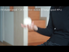 만약 슬로 모션으로 편집하기 위해서 고속 프레임 레이트로 촬영할 경우에 셔터 스피드는 어떻게 설정하여야 할까? 일례로 60 fps로 촬영하고 슬로 모션으로 30 fps로 재생하도록 편집할 생각이라면 60 fps로 촬영한다고 해도 셔터 스피드는 1/120 sec이 아니라 편집 후 실제 재생 속도를 감안하여 1/60 sec으로 설정하는 것이 효과적이지 않을까 하는 의문을 가지게 된다. 이 경우에는 딱히 답이 정해져 있는 것 같지는 않다. 실제 움직이는 물체를 비교적 선명하게 표현하고 싶다면 1/120 정도를 선택하는 것이 좋고 움직이는 물체의 동적인 느낌을 살리고 싶다면 1/60으로 촬영할 수도 있겠다. 실제 슬로 모션으로 재생할 경우에 움직임에 의한 블러 효과가 비교적 잘 보이므로 슬로 모션에도 동일한 기준(프레임 레이트 x2의 셔터 스피드)을 적용하는 것이 더 일반적이지 싶다. 빗방울이 떨어져 파동을 일으키는 모습을 촬영한다면 실제 빗방울의 움직임보다는 그로 인해 만들어지는 파동 등을 선명하게 담고 싶은 경우 등이 더 일반적이기 때문이다. 슬로 모션을 활용하는 이유 또한 그 장면을 자세히 보라는 의미가 강할 테니 아무래도 심한 블러보다는 선명한 것이 낫다. (실제로 어지간한 움직임이 아니고서야 그 차이를 체감하기는 어렵겠지만 효용 측면에서 더 낫지 싶다)