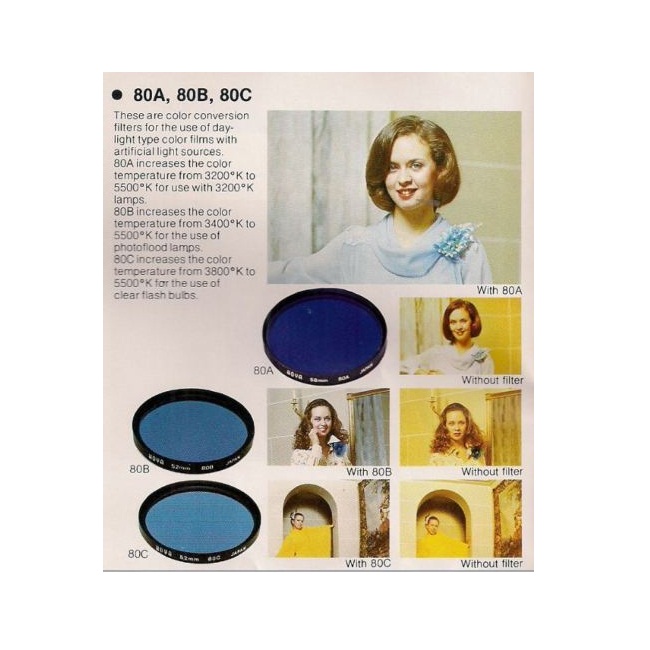 대표적으로 80A/B (Cool-down, Blue filter), 81A/B(Warm-up), 85A/B (Warm-up, Orange filter) 등이 있으며, 가변 색온도 전환 필터도 제품도 본 기억이 있다. 디지털카메라에서는 화이트 밸런스 설정으로 매우 쉽게 색온도를 조절/설정할 수 있어서 해당 필터를 활용할 기회는 거의 없다시피 하지만, 필름 카메라에 특히 슬라이드 필름 등을 사용하여 촬영 시에는 촬영 시의 색온도에 맞춰 촬영하는데 유용하다.