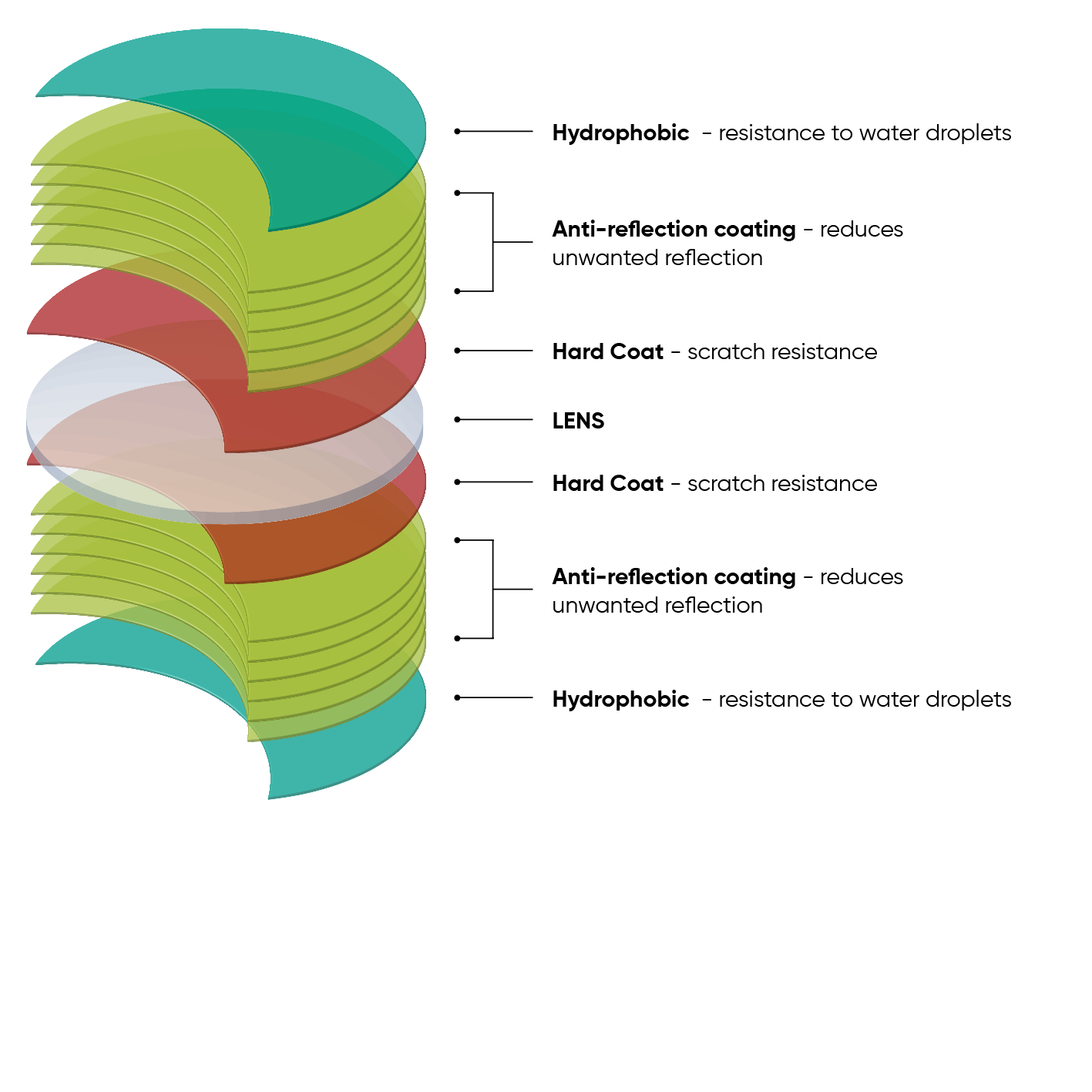 멀티 코팅은 여러 기능을 가진 복합 코팅을 의미한다. 즉, 반사방지 기능과 오염 방지 기능이 결합된 멀티 코팅 유형, 또는 반사방지 + 발수 기능의 멀티 코팅도 가능하다. 그리고 다양한 기능 구현을 위해서 다층의 코팅으로 이루어진다. 예를 들자면, 반사방지 코팅이 없이 발수와 오염 방지 그리고 내구성 향상을 위한 하드 코팅으로만 이루었진 멀티 코팅도 생각해 볼 수 있다.