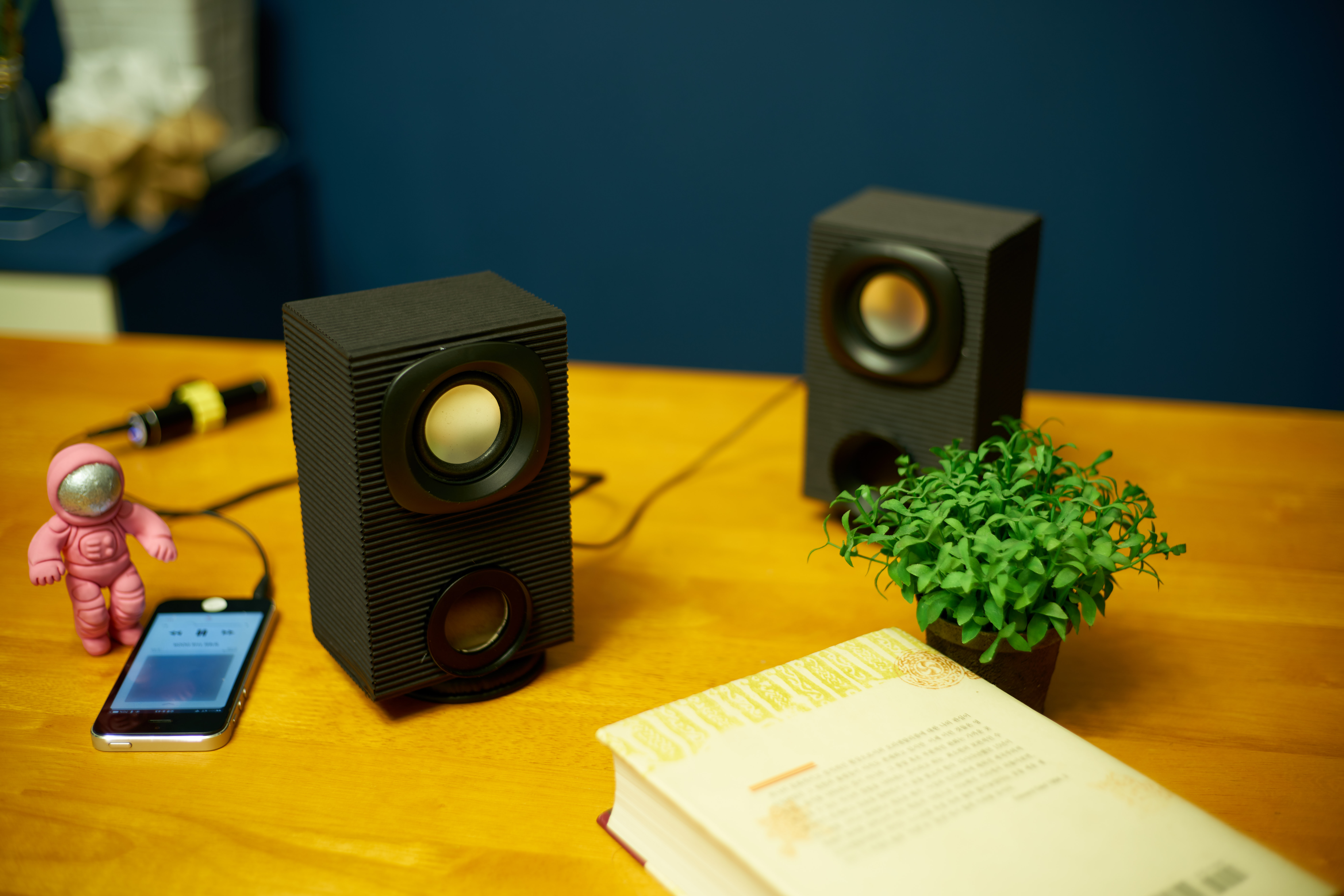 다이소에서 구매한 (USB 전원으로 작동하는) 작은 컴퓨터용 스피커를 골판지를 사용해서 트랜스미션 라인 스피커로 만들었다. 저렴한 가격 탓에 소리가 그리 마음에 들지 않아 사용하지 않고 방치했는데, 주말과 휴일을 틈타 개조에 도전했다. 내부의 작은 전자 회로를 통해 증폭(amplifier)이 이루어지고 두 개의 스피커로 회로에 연결되어 구성되어 있지만, 두 전선 모두 접점을 공유하는 것으로 보아 스테레오를 지원하지 않는 것 같다. 개조한 스피커의 내부 구조를 각각 다르게 설계해서 이런 단점을 보완할 수 있을까?