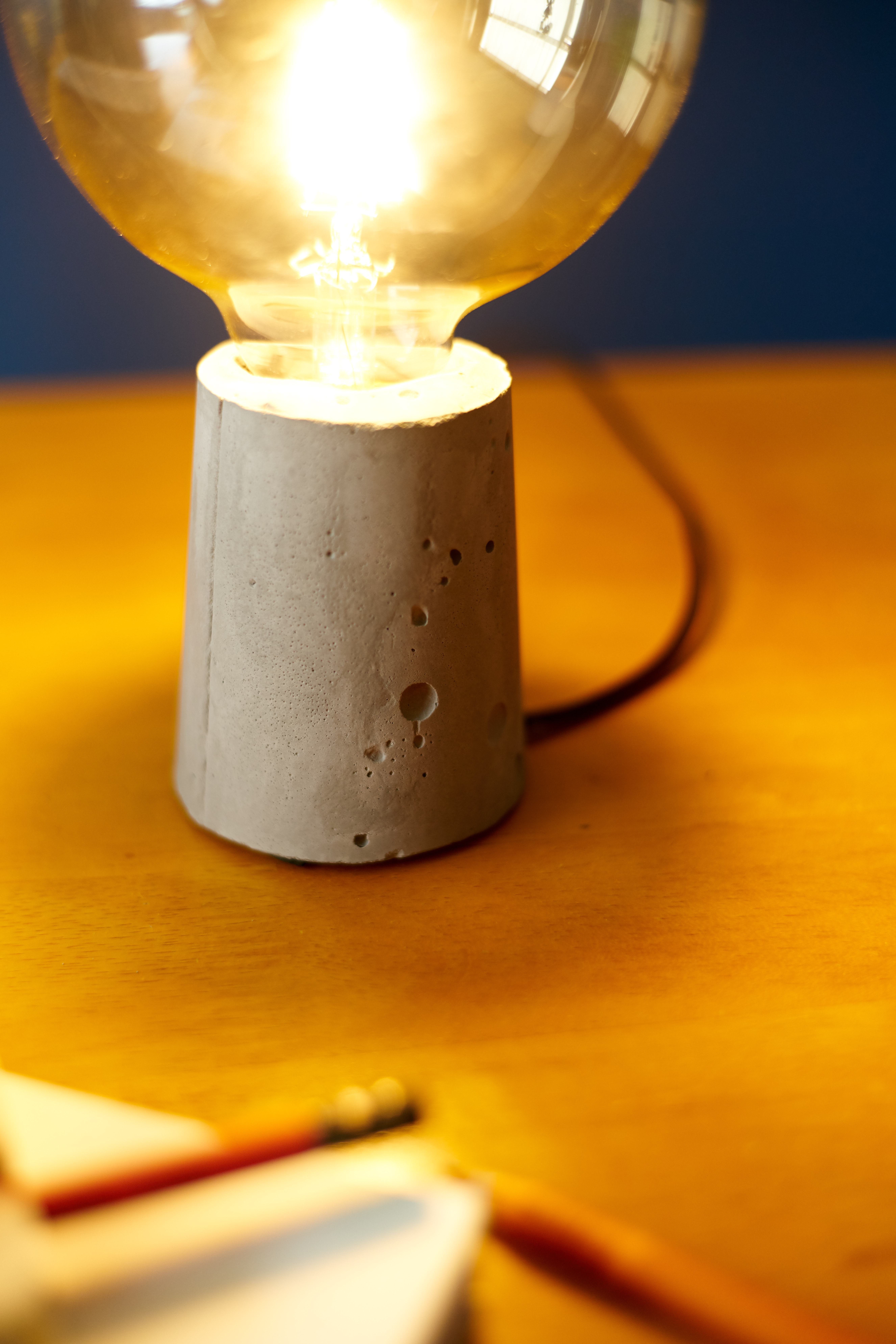 이전 옷걸이로 간단한 테이블 램프 받침(베이스)을 만들었는 작고 가벼운 장점은 있었지만, 안정감이 떨어졌다. 특히 테이블 위에 유리 전구와 함께 올려두면 불안 불안했었다. 콘크리트로 만드니 안정감 문제는 간단히 해결되었고, 의도치 않게 생긴 표면의 기포 자국은 콘크리트 특유의 질감을 강조해서 마음에 든다.