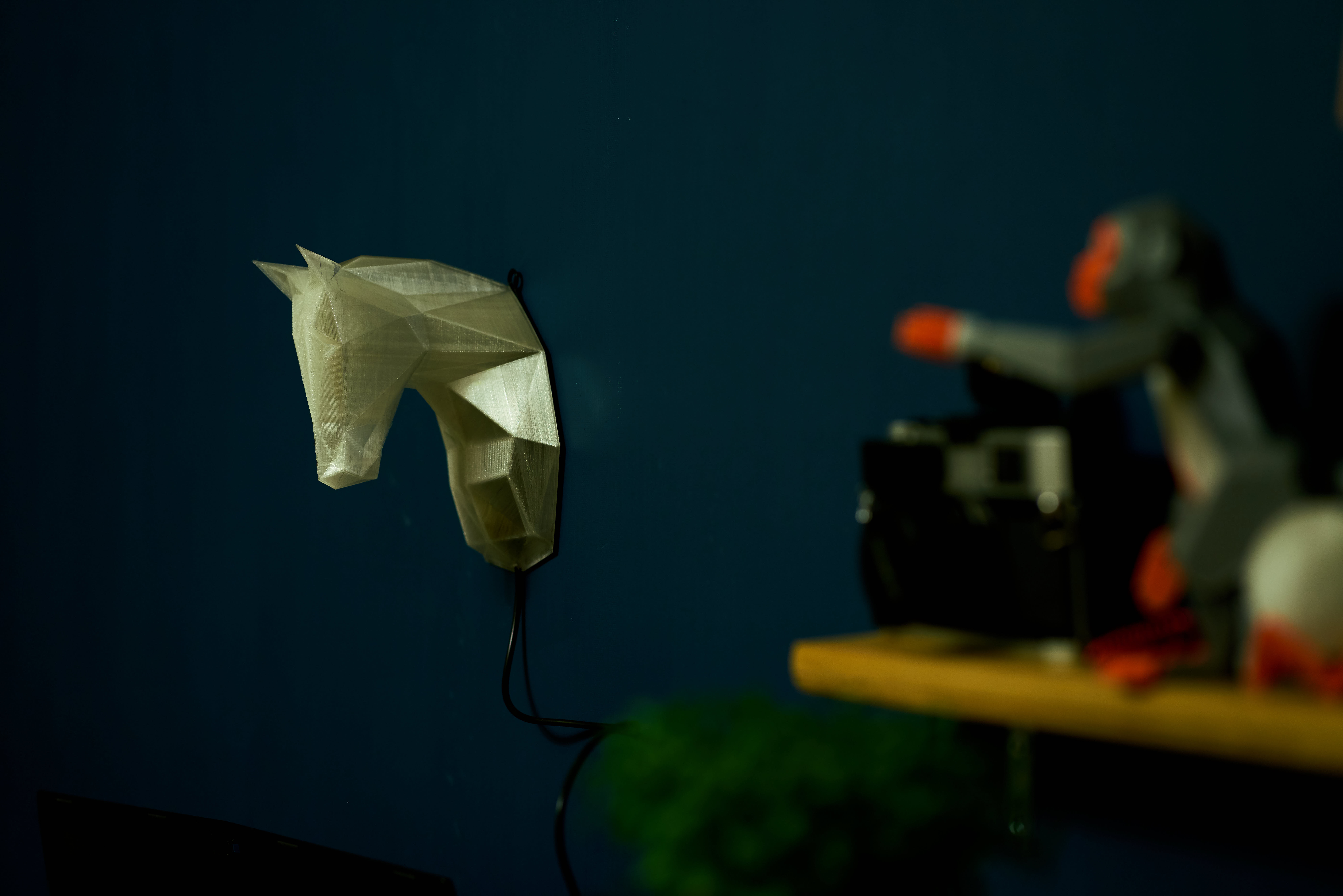 책상 앞의 밋밋한 벽을 장식하고 싶었고, 이왕이면 조명처럼 불을 밝히는 기능이 있었으면 했다. 거대한 사슴뿔 모양이나 그로테스크한 뼈 모형 등도 좋을 듯한데, 너무 괴기스러워 보일 듯해서 말머리 모양을 선택했다.