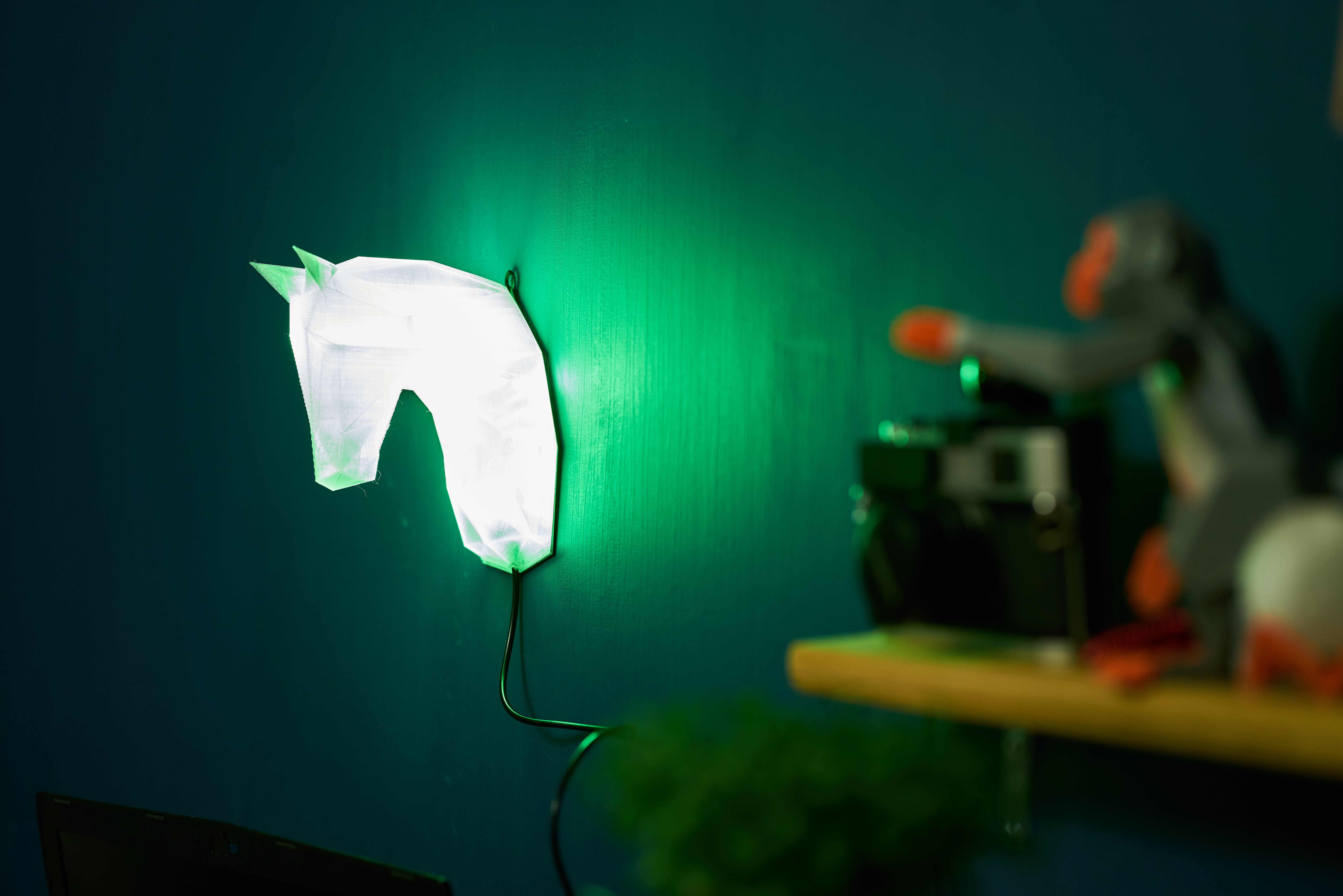 실내 벽 장식용 소형 말머리 램프이며 투명 필라멘트를 사용한 3D 인쇄 및 LED 조명으로 구성되었다. USB 전원에서 작동하고, 선택에 따라 원하는 색으로 바꾸는 것도 좋겠다.