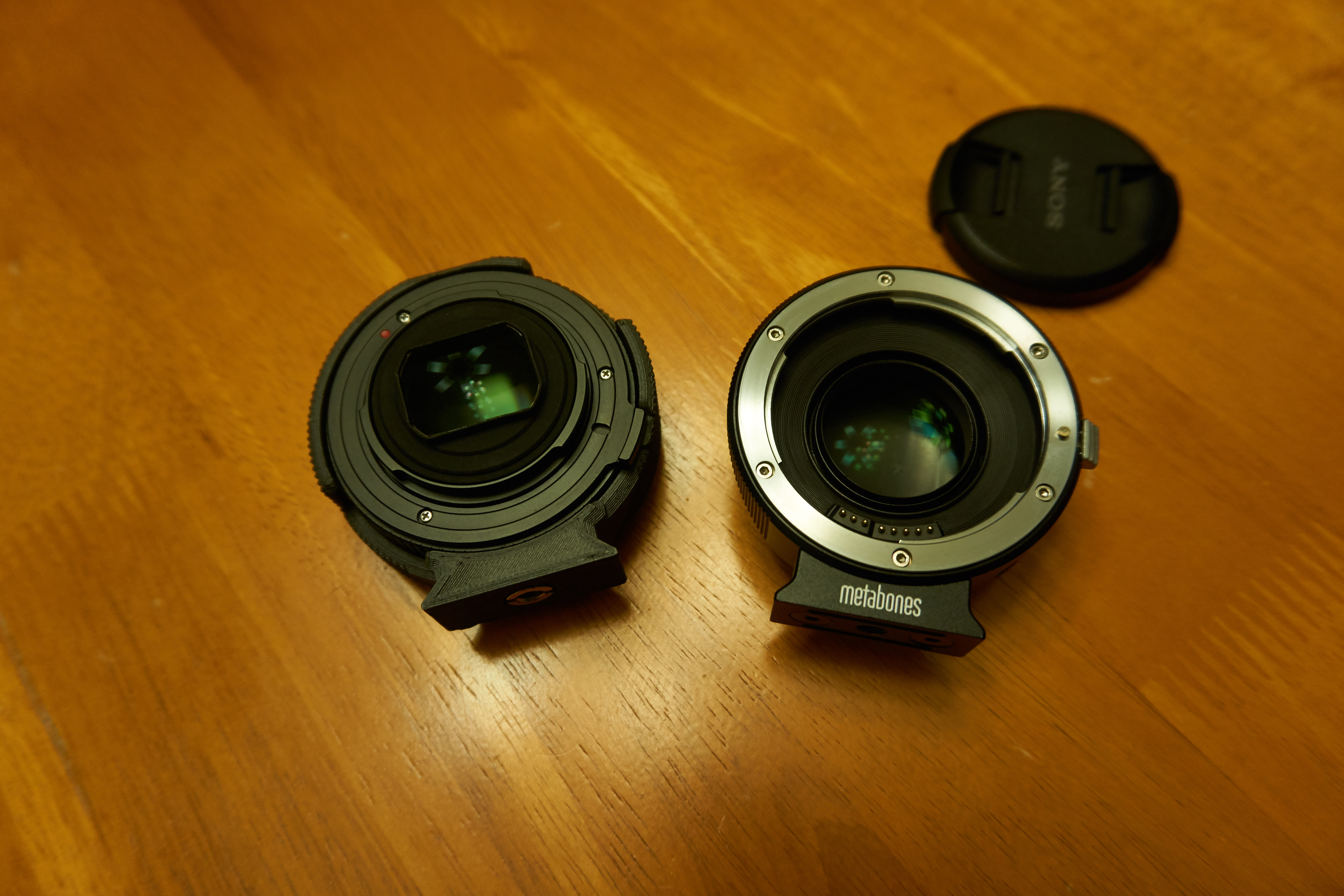 렌즈 터보는 렌즈와 카메라를 연결하는 전기 접점이 없고, 메타본즈의 스피드 부스터는 EF 렌즈를 E 마운트 또는 MTF 마운트의 카메라에 사용할 경우 전기 접점을 통해 AF 기능와 조리개 조절을 활성화할 수 있다.