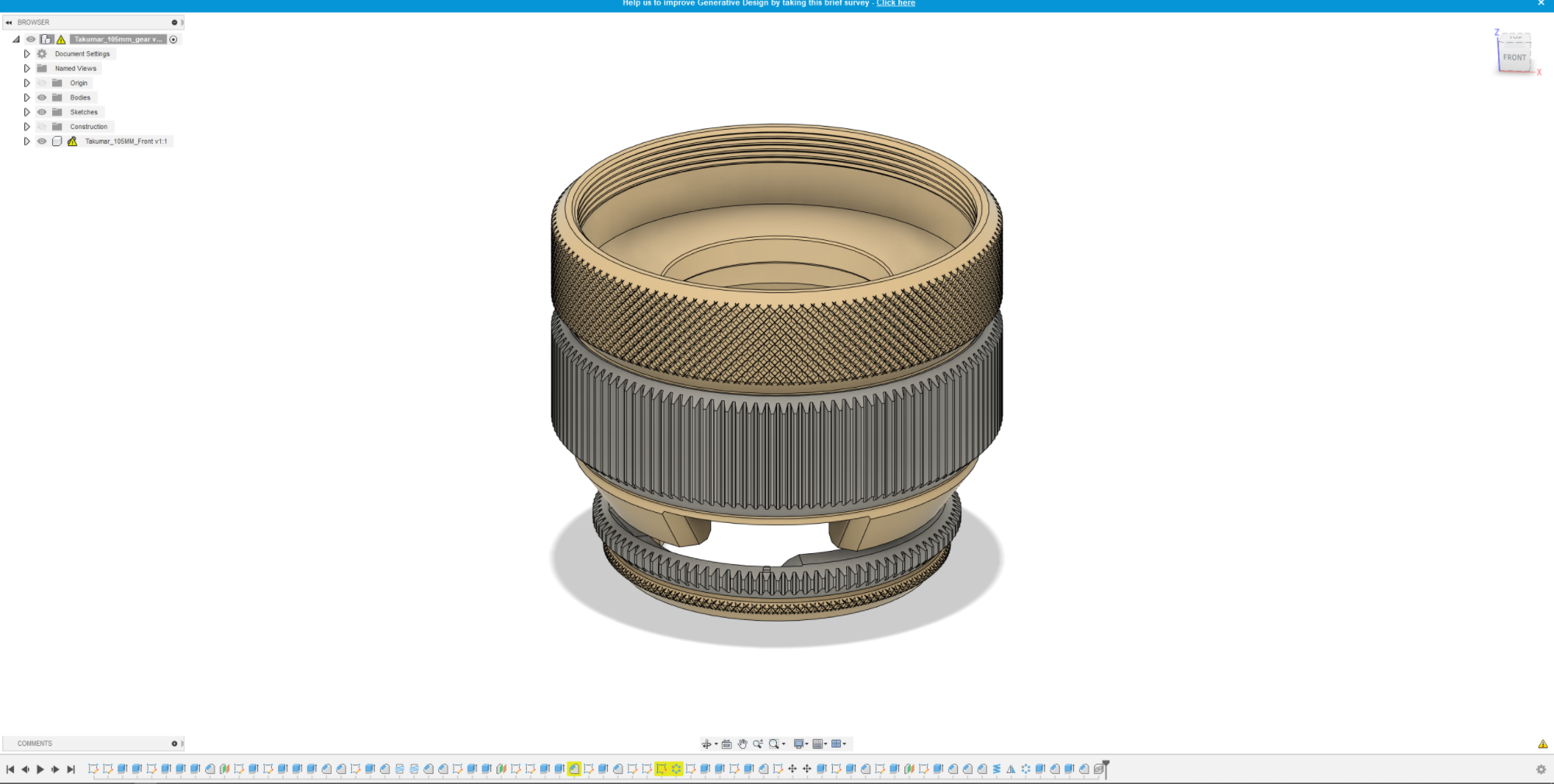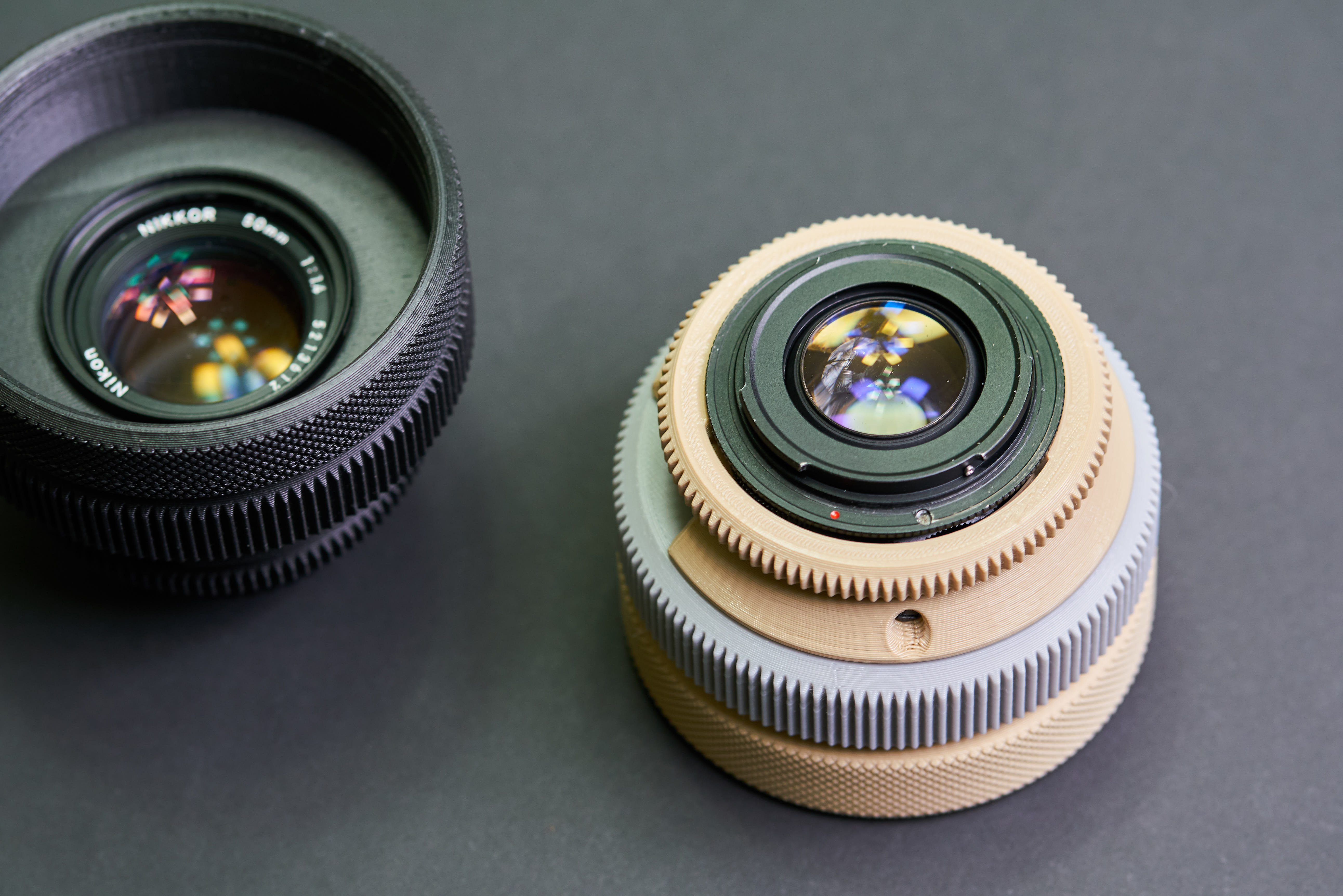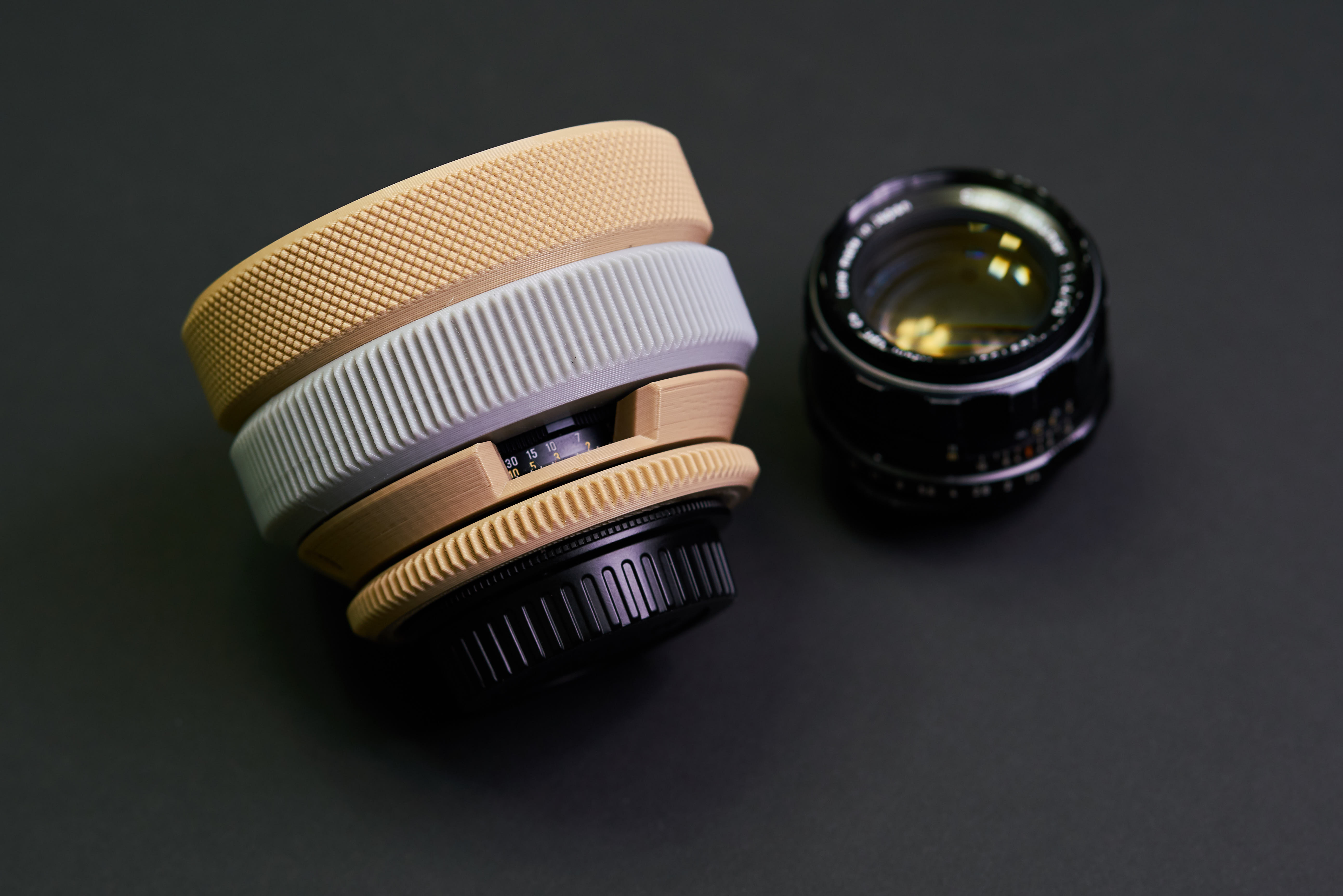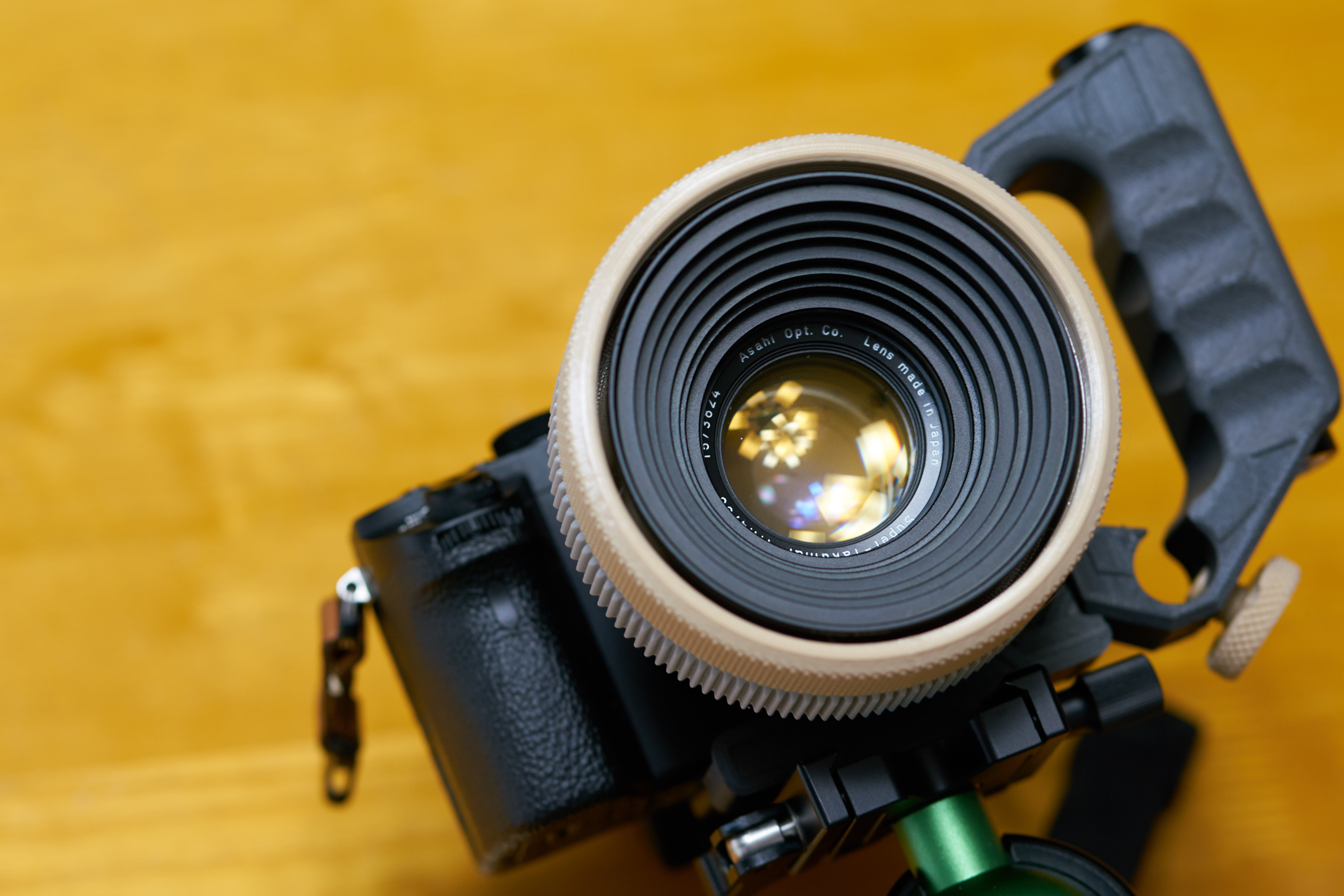 비디오 촬영을 위해 구형 SLR 카메라의 MF 렌즈 (수퍼 타쿠마 50mm f1.4)를 개선하는 시네마틱 렌즈 리하우징이며, 또한 초점 기어 사양을 다른 시네마 렌즈와 유사하게 유지하려고했기 때문에 초점 기어의 외경은 100mm와 123 개의 톱니 돌기로 구성되었다.