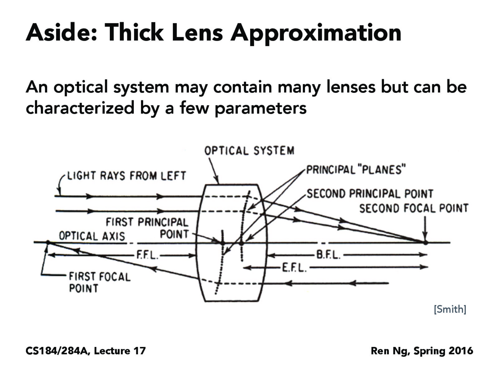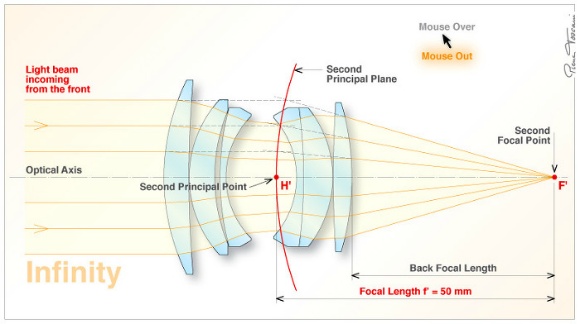 평행으로 입사한 광선이 '무한대에 초점이 맞을 때'의 광학계의 제2주점(second principal point)과 촬상면까지의 거리가 그 렌즈의 초점거리가 된다. (무한대에 초점이 맞을 때라는 점에 유념하자!) 제2주점을 말로 설명하는 것보다 그림으로 이해하는 것이 더 좋겠다. 광학계 입사구로 평행하게 입사하는 광선과 초점 그리고 제2주점의 관계를 이해할 수 있다. 마지막 세 번째 이미지는 입사하는 빛의 추적선과 조리개의 역할을 이해하는데 도움이 되지 싶어서 추가하였다. 조리개 개구(입사동)의 크기를 조절하여 주변부로 입사하는 광선을 차단하여 촬상면에 노광 양을 조절할 수 있으며, 조리개 개구의 위치 또한 광학계의 중심인 제2주점에 위치하는 것이 광학 설계에서 가장 효과적이다.