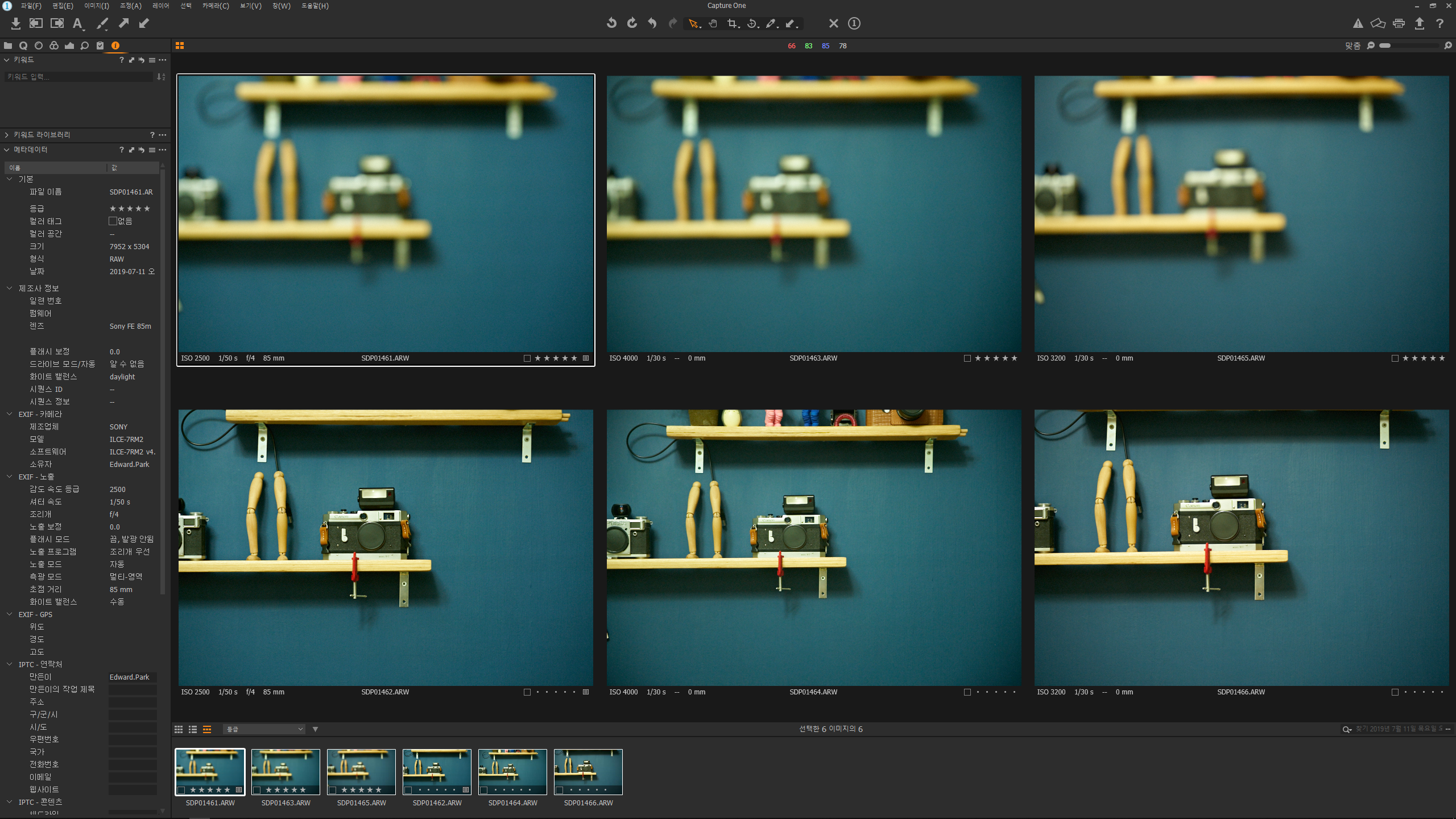 좌측부터 Sony FE 85mm f1.8 VS Canon 28-105mm f3.5-4.5 VS Canon 75-300 f4-5.6 is를 각각 장착하고 85mm 화각에 맞추어 삼각대에 고정하여 각각 촬영, 위쪽- 무한대 포커스, 아래쪽 - 약 1.6mm 초점거리
