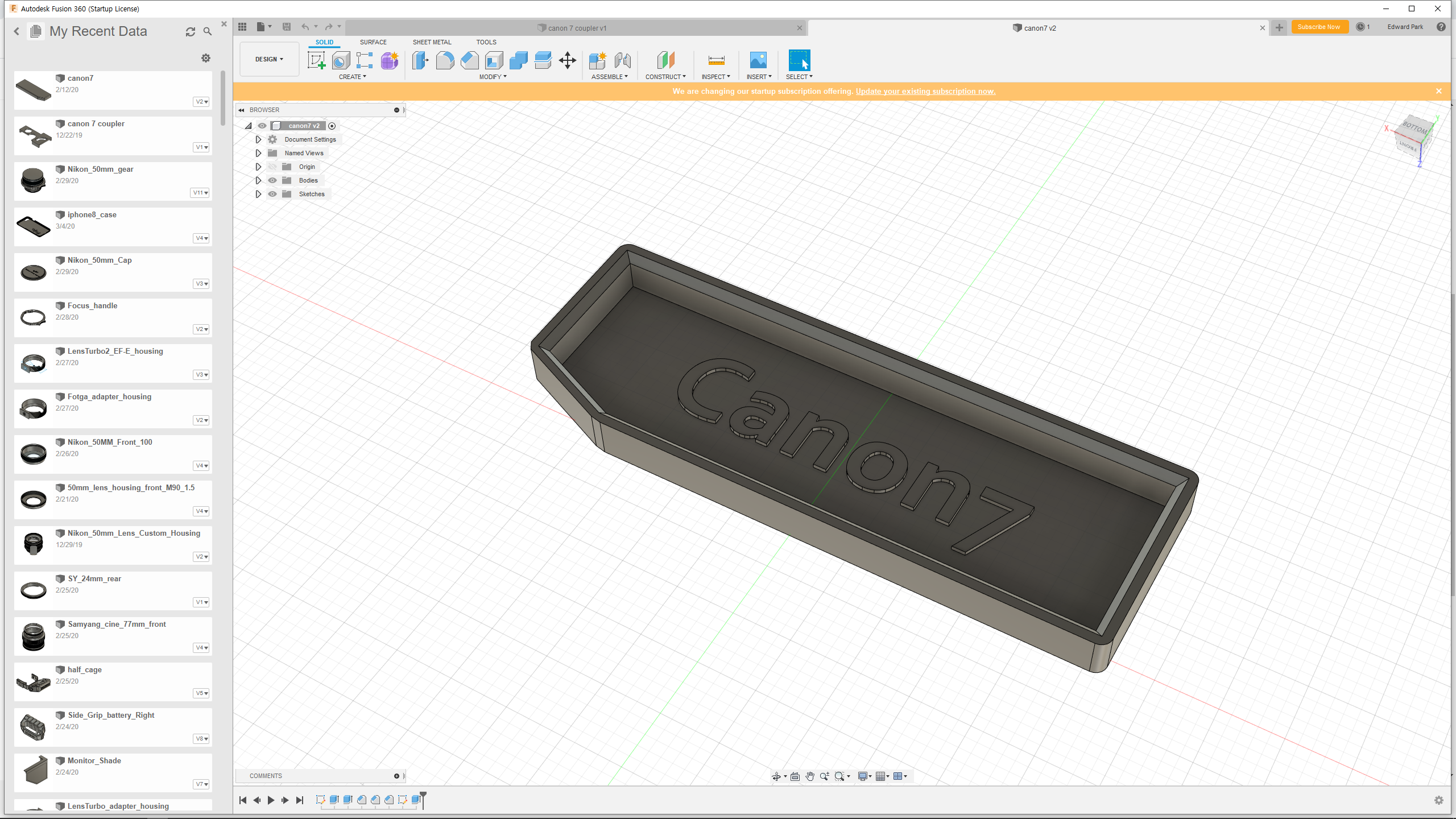 캐논 7 RF 카메라의 셀레늄 셀 또한 카메라 전면에 노출되어 있어서, 생활 공간에 진열해 두다 보면 자연히 일상의 빛에 노출되는 문제 때문에 셀레늄 셀을 검은 마스킹 테잎 등을 이용해 막아두곤 했다. 막상 사용하려면 이를 제거해야 하고 다시 보관을 위해서는 붙이는 것이 번거로워서 차광용 캡을 사용하는 것이 낫겠다 싶어서 간단히 모델링하고 PLA 필라멘트를 사용해서 출력했다. 한달 정도 전에 완성했는데, 별 다른 변형없이 그럭저럭 쓸만한 듯하다.