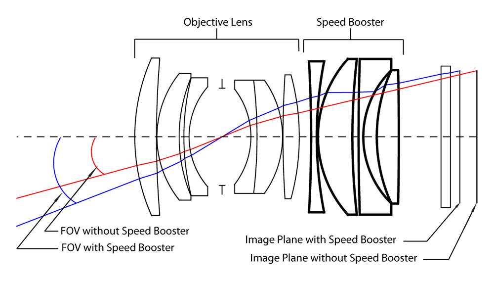 포컬 리듀서의 광학적 특징에 주목해 보면, 증가하는 시야 범위(FOV)와 함께, 이미지 상점이 맺히는 (광축 상) 위치 또한 짧게 변동하는 점을 유념할 필요가 있다. 위에 이미지에서 직관적으로 설명하고 있으므로 따로 부연할 필요는 느끼지 못하지만, 노파심에 몇 자 덧붙이면 이는 포컬 리듀서의 개입으로 원래의 렌즈의 플랜지 백 거리(frange back distance)가 변하는 것이며 따라서 포컬 리듀서 광학 요소가 없는 단순한 확장형 어댑터와 비교하면 포컬 리듀서 확장형 튜브의 길이가 이를 반영하여 일정 짧아져야 포커싱 영역 전반에 초점이 맞게 된다.