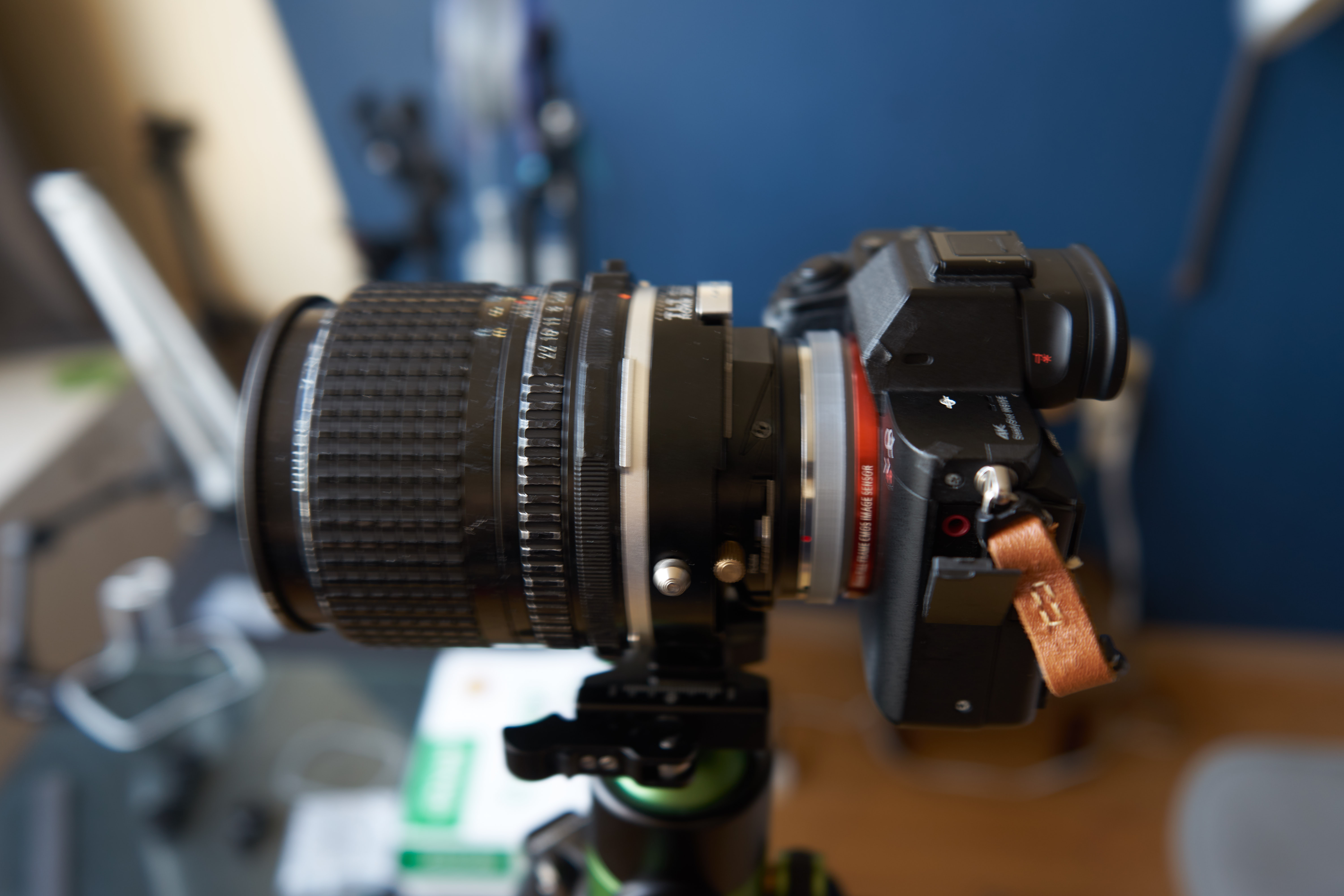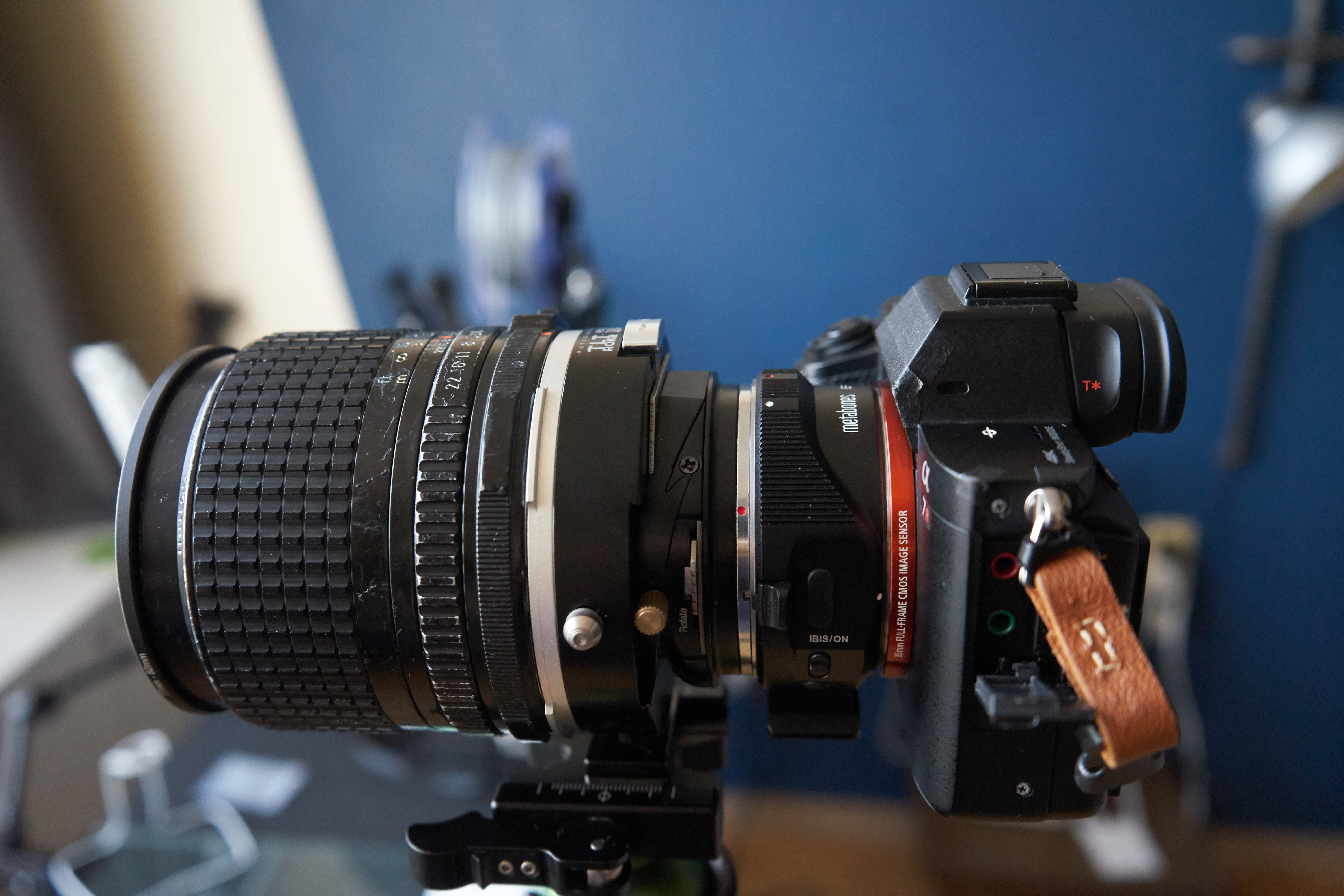 렌즈와 어댑터 (개조된 포컬 리듀서와 비교를 위한 일반 어댑터), 카메라를 모두 장착한 이미지는 아래와 같다. 전체 플랜지 백 거리는 약 20mm 가까이 감소하였는데, pentax 67 시스템의 플랜지 백 거리가 약 85mm 정도에 해당하므로 65mm 내외(거의 petax 645 플랜지 백 거리와 유사)로 줄었다.