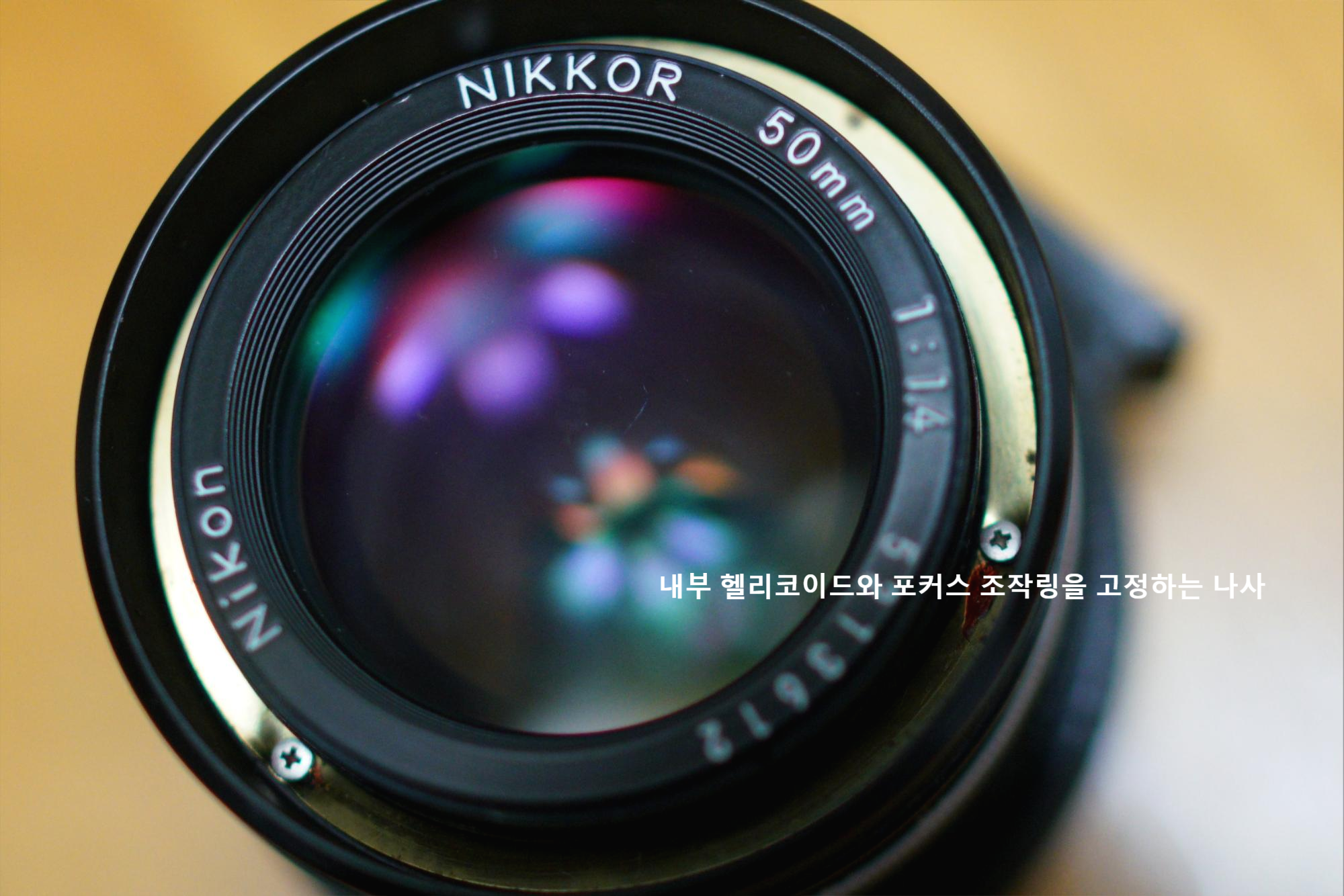니콘 Nikkor 50mm f1.4 렌즈의 전면 분리 과정을 간단히 정리하면, 경통이 최대로 돌출하도록 포커스 링을 위치시키고 돌출된 경통 측면의 나사 하나를 제거하고 전면부를 시계 반대 방향으로 회전하면 위 이미지처럼 분리된다. 원형으로 배치된 3개의 나사를 풀고 헬리코이드와 외부 어셈블리를 조정하여 무한대 조정이 가능하다. 금색 링이 헬리코이드와 경통을 맞물려주는 구조이므로 분리해서 내부 구조를 확인하는 것도 좋다.