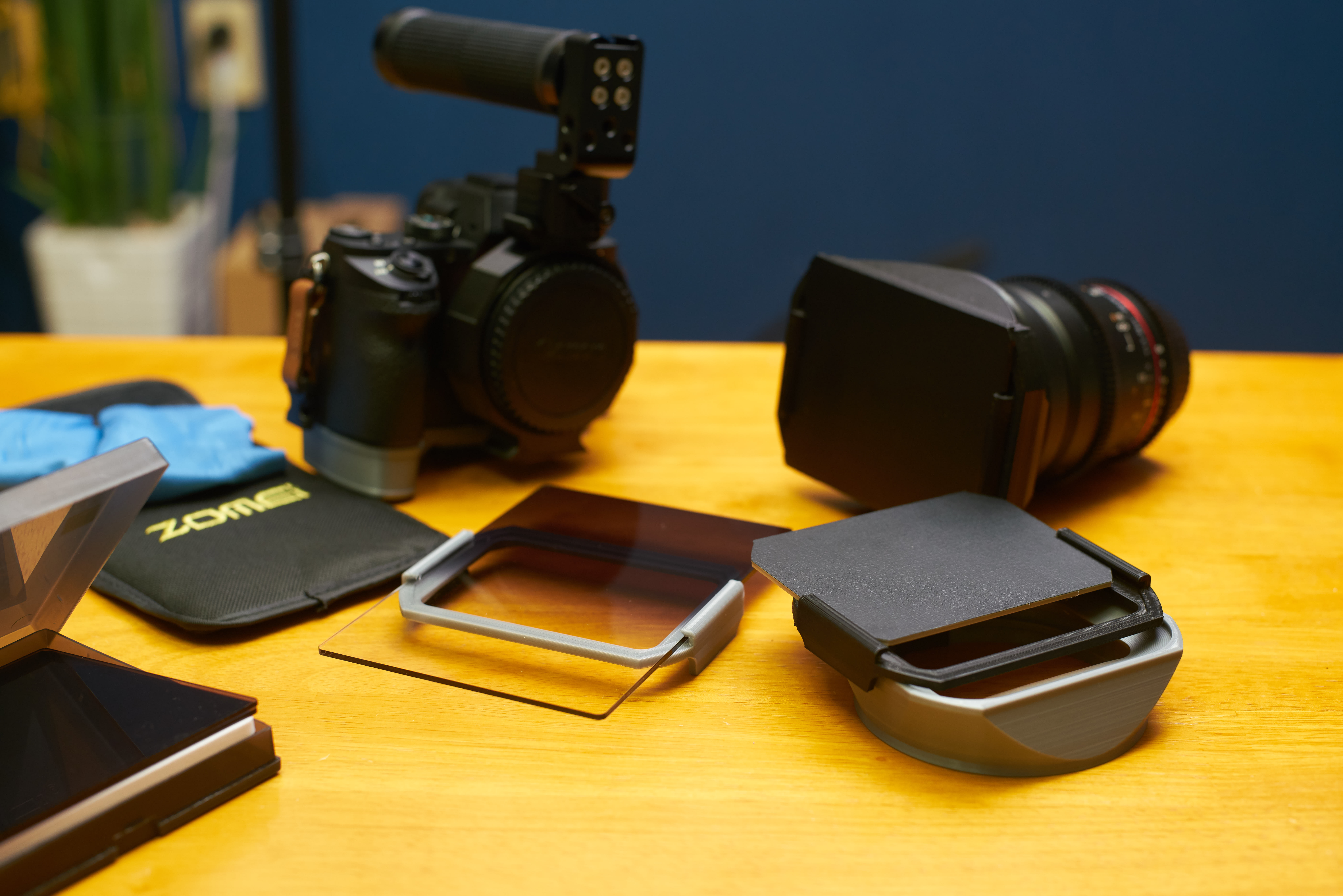 스퀘어 필터 규격은 Cokin Z-pro 규격 (4"x4" 또는 100x100mm, 4"x6" 또는 100x150mm)으로 만들었고, 일반적인 사각 필터의 두께에 맞춰서 별도의 잠금이나 고정 장치 없는 형태라서 스퀘어 필터의 두께가 설정한 값과 다를 경우 흘러내릴 우려가 있지만, 가장 단순하고 가벼운 형태를 바랐다. 그리고 필터를 사용하지 않을 경우에는 별도의 캡을 스퀘어 필터처럼 끼워서 렌즈 캡 역할을 하도록 고안했다.