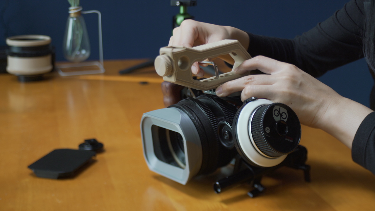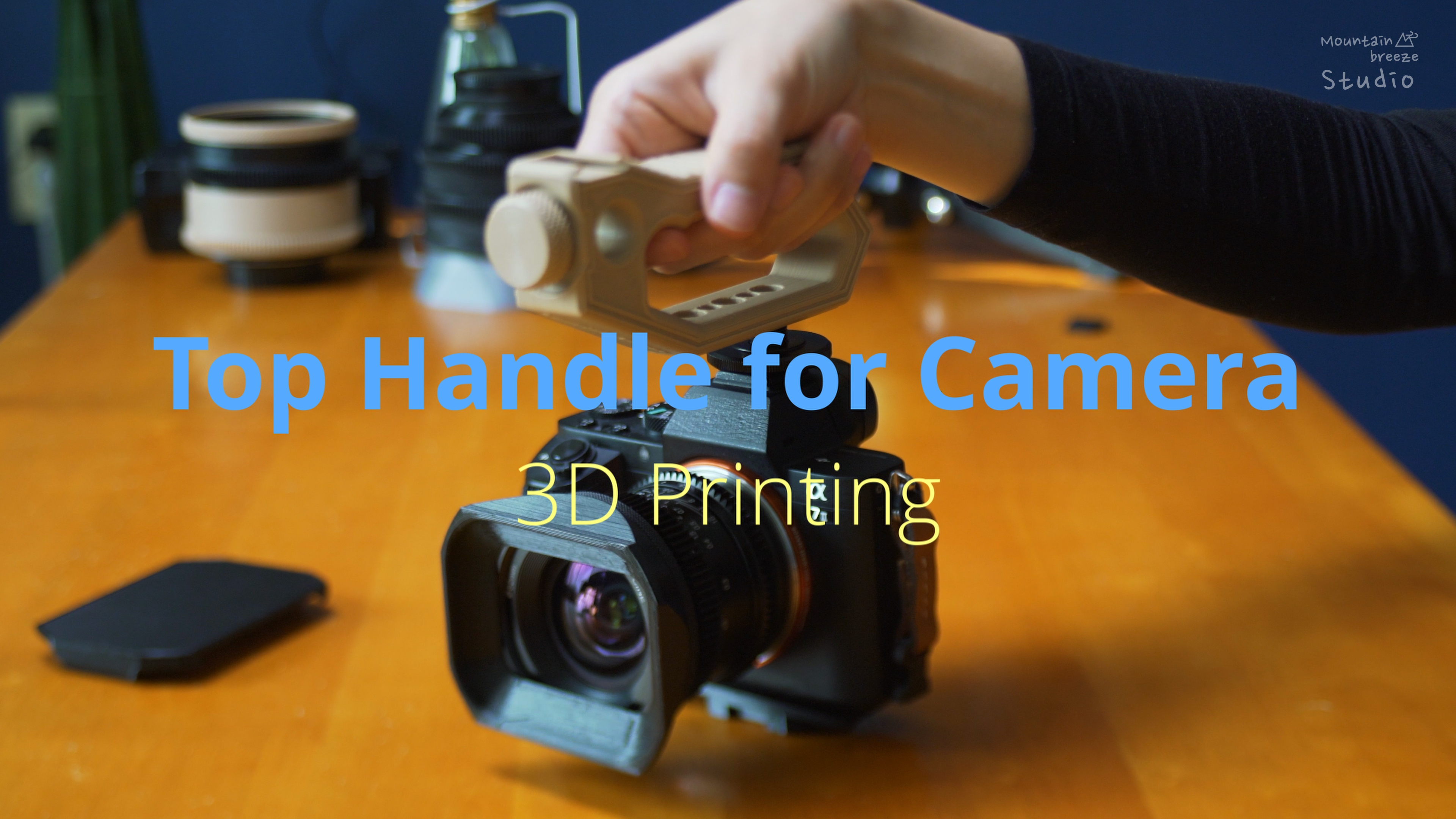비디오 카메라의 탑 핸들을 참고해서 3D 프린팅으로 가벼운 탑 핸들이 좋은 대안이 될 듯해서 만들어 보았다. 3D 모델링은 퓨전 360으로 그리고 프린팅은 엔더_3, PLA를 사용했다. 상단에 콜드 슈(악세사리 슈)와 15mm 로드 장착과 고정 장치를 갖춘 형태로 설계했다. 이를 통해 필드 모니터나 마이크 등 보조 장치를 장착하여 활용도를 높일 수 있지 싶다.