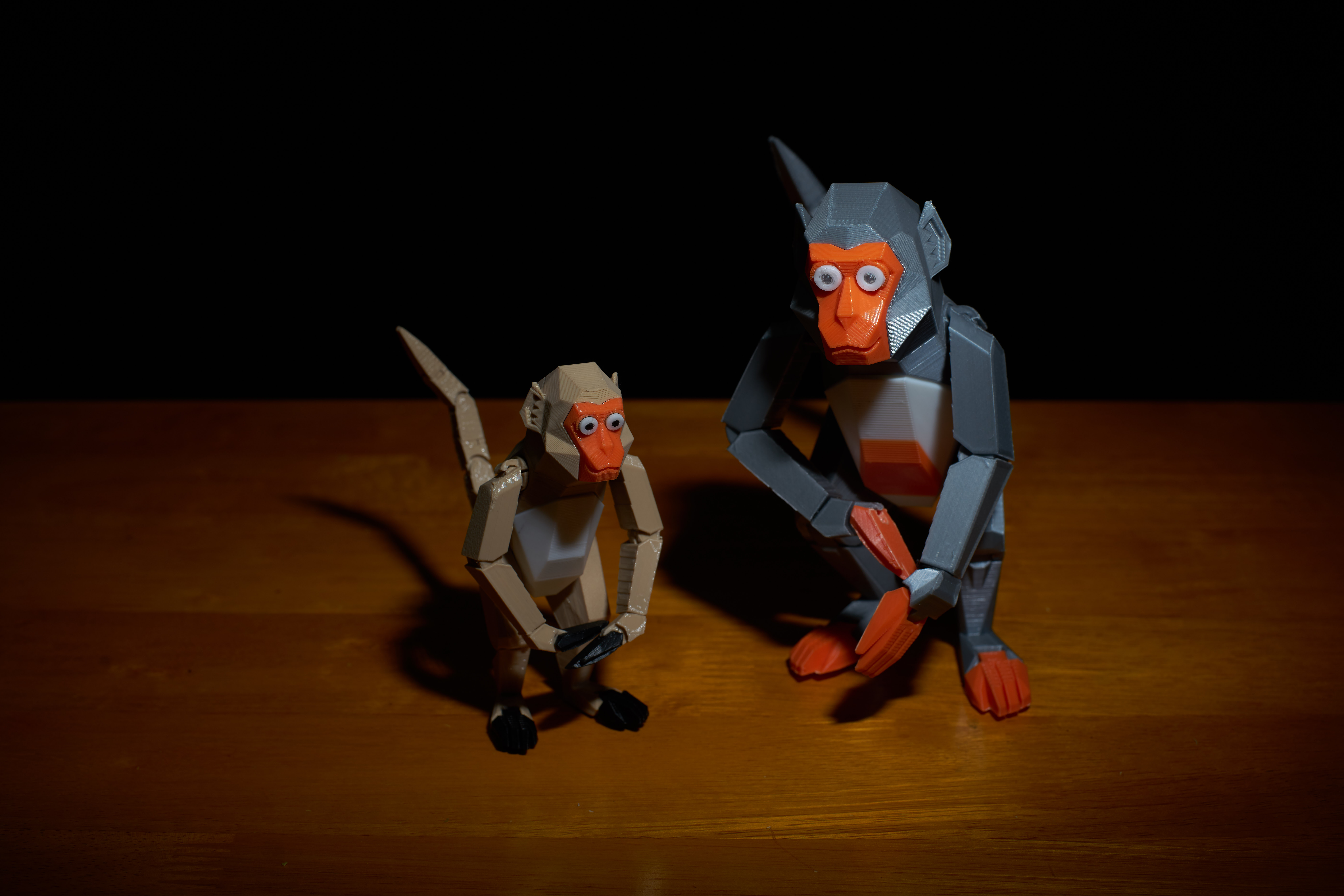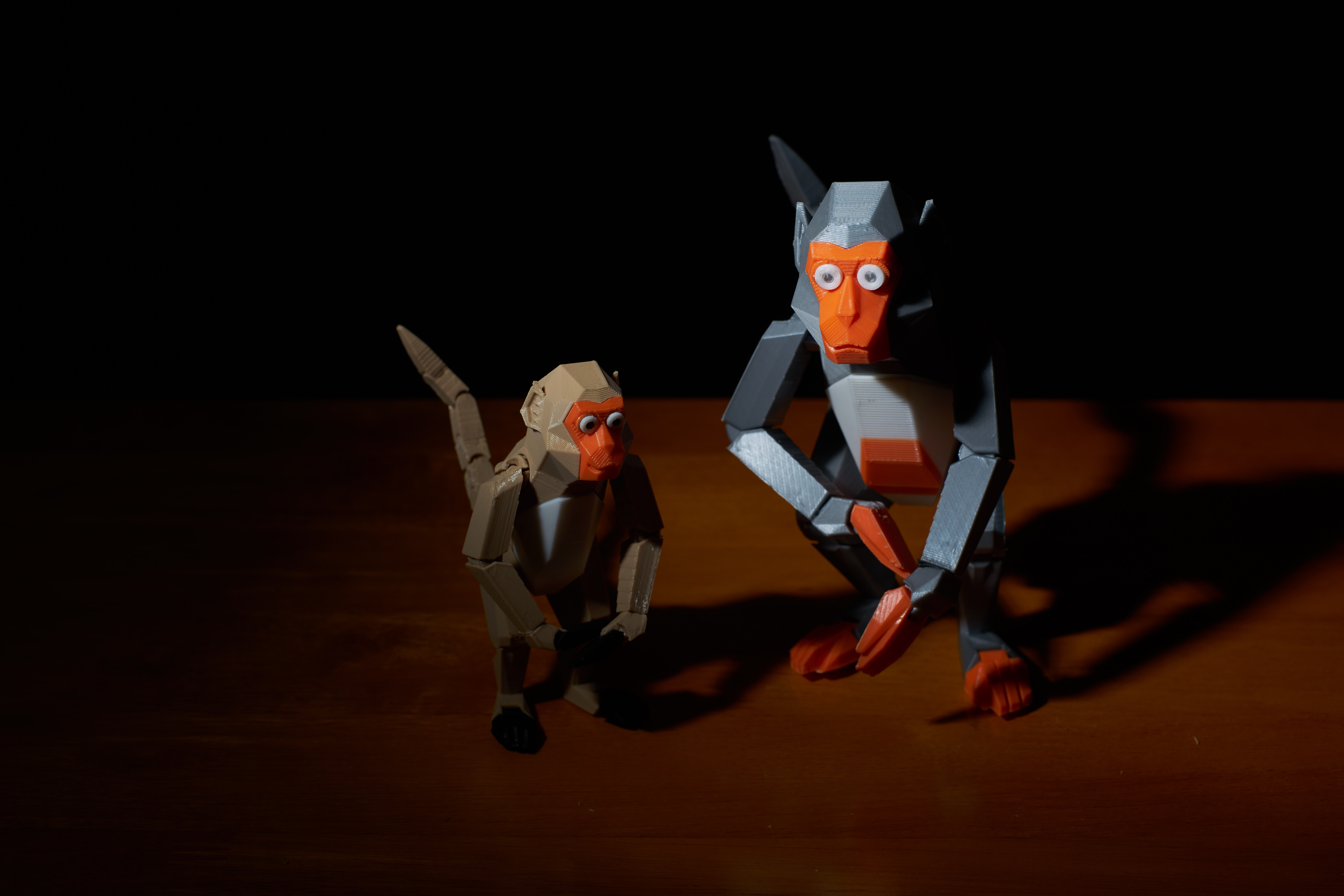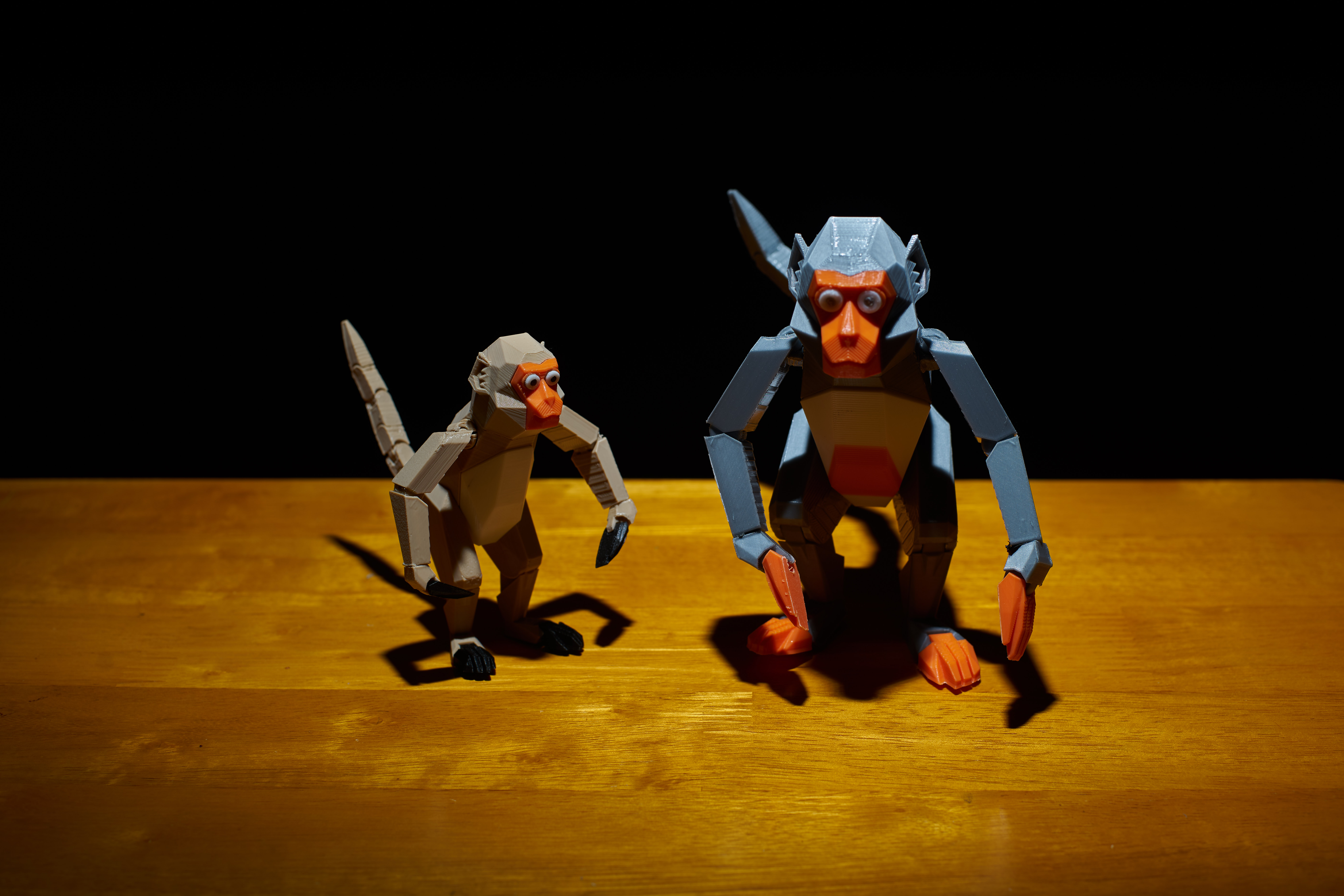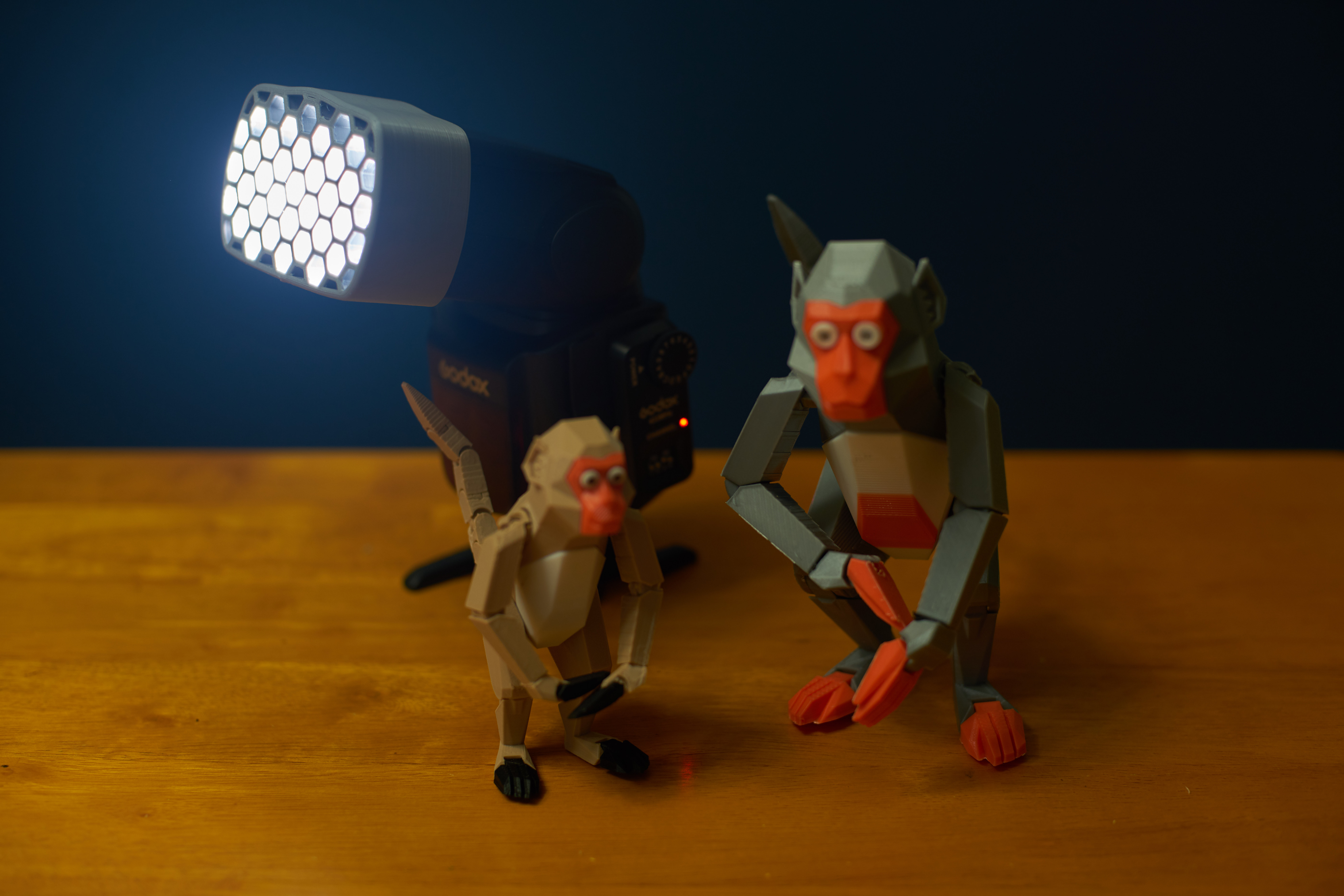 만든 기념으로 그리드를 플래시에 장착하고 무선 동조기를 활용해서 3D 프린터로 출력한 원숭이를 모델로 몇 장 샘플을 촬영하였다. (원숭이 모형 크기가 20센티 내외라서 플래시를 매우 근접해서 발광하였다. 인물 촬영 시에는 피사체가 커지는 것에 비례해서 플래시와 피사체 거리를 조정하는 것이 좋겠다)