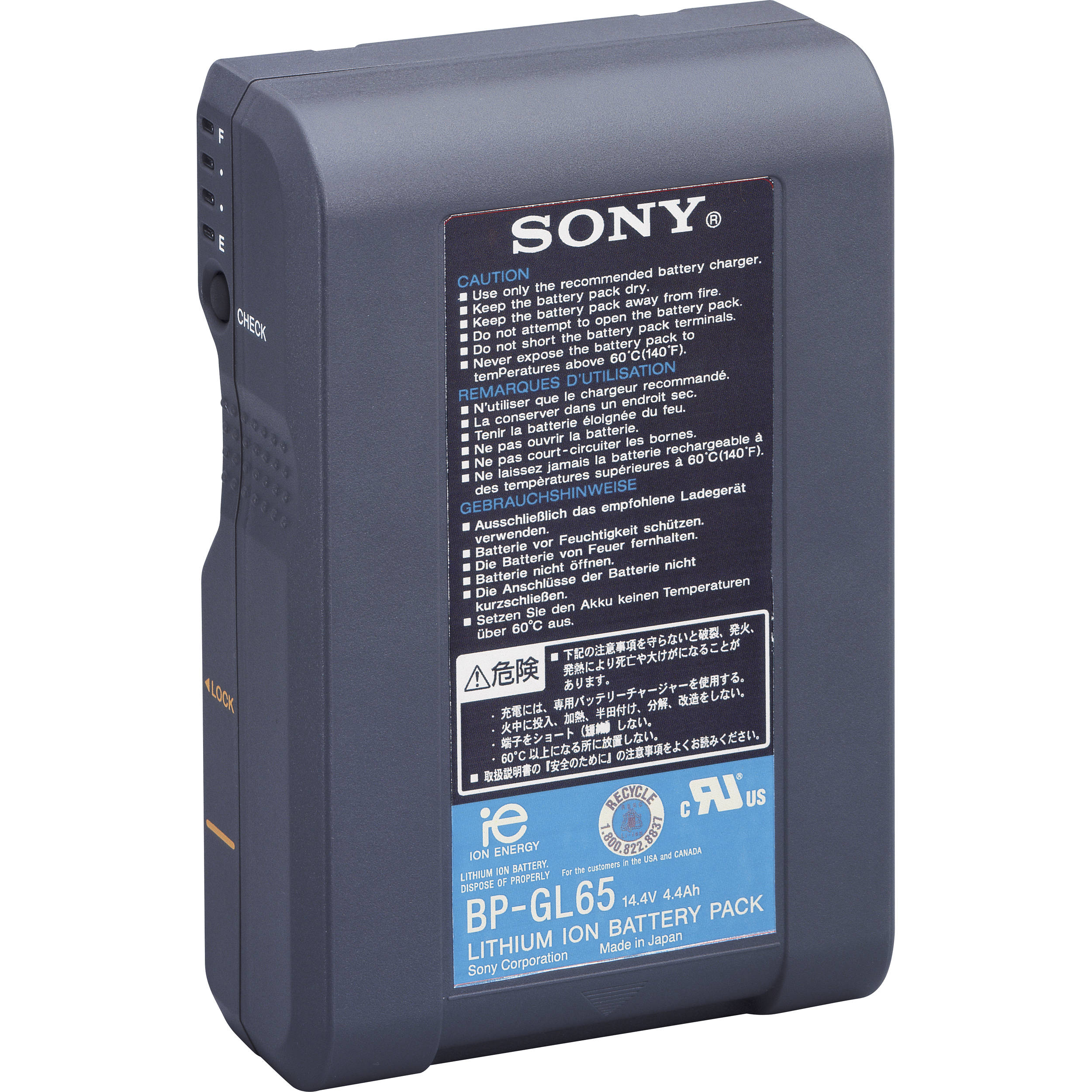 측면의 D-tap 단자가 있는 V 마운트 배터리의 경우 출력 전압은 14.8V가 일반적이고, 이 단자를 통해 충전할 수 있는 경우가 일반적이다. (개별 모델별로 내부 보호회로의 기능에 차이가 있을 수 있으므로 확인 후 충전을 권장함), 일반 충전(기) 전압은 16.8V(2~3A)다. 고전류용 충전기를 사용하면 충전 속도가 빠르겠지만, 이 또한 개별 제품에 따른 내부 보호회로에서 허용하는 전압/전류에 대해 먼저 확인하자. 배터리 충전과 사용 시 전류량은 발열 정도와 관련되고, 사양 이상의 과도한 과전류(쾌속) 충전과 방전은 발화나 배터리 수명 단축의 원인이 된다. (따라서 배터리 보호회로에서 권장 사양보다 높은 과전류 충전/방전, 온도 상승의 경우 작동 차단으로 보호된다)