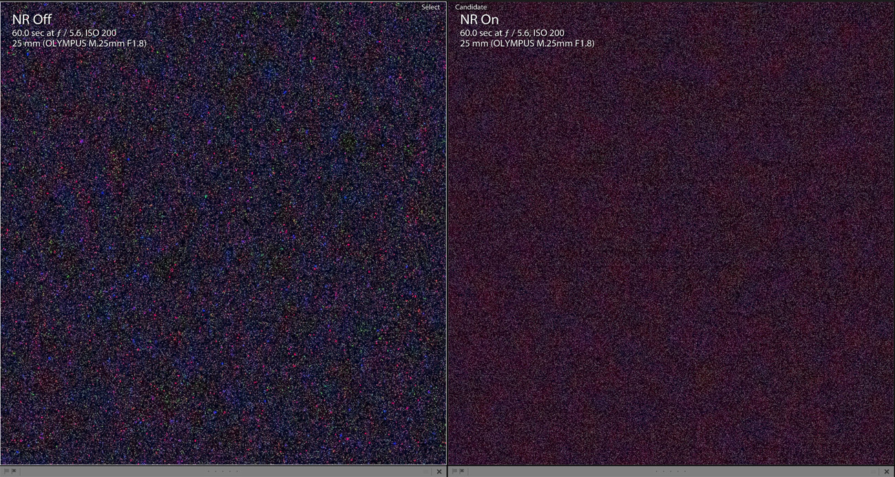 고감도 ISO NR이니 다중 촬영 노이즈 감소 기능이 Raw 파일 촬영 모드에서는 적용되지 않는 반면, 장시간 노출 NR은 Raw 파일 촬영 모드에서도 선택 가능하다. 하지만, 라이트 룸 등에서 Raw 파일을 불러올 때, 장시간 노출 NR이 적용된 값을 불러오지는 않는 것 같다. 카메라 제조사의 Raw 파일 형식이 저마다 다르고, 촬영 시 설정한 셔터 스피드, 감도, 조리개 값 등의 매개 변수(파라미터)는 워킹 프로파일 상에 저장하는 것이 일반적이다. 이미지 뷰어나 후보정 프로그램 등에서 로우 파일의 정보 중 일부를 선택적으로 표시하지만, 장시간 노출 NR 등의 파라미터는 근래 즐겨 사용되는 라이트 룸이나 캡처원 등에서는 지원하지 않는 것으로 알고 있다. 카메라 제조사에서 공식 지정한 로우파일 이미지 뷰어/편집 소프트웨어 프로그램에서 지원하지 않을까 생각하지만, 개별적인 확인을 하지는 못했다.