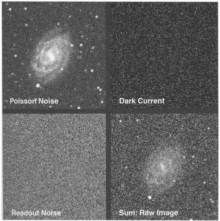 암전류 노이즈 -Dark shot(or current) noise- 암전류는 열에 의해 발생하는 경우가 가장 많으므로 장노출 촬영 등으로 고온 픽셀에서 암전류가 주로 발생한다. 암전류에 의해 과포화된 픽셀의 노이즈는 결과 이미지에 핫픽 셀로 나타나서 앞에서 언급한 점 잡음과 같이 명도가 튀는 흰점으로 나타난다, 장노출 촬영에서는 셔터 스피디 선택에 따라 장시간 이미지 센서가 광자를 포집하여야 해서 필연적으로 열이 발생하고 그 결과 암전류가 생기고 노이즈가 된다. 학창 시절 물리 시간에 배웠듯이 열은 전자의 이동에 임의성을 발생시키고 이런 불규칙성이 암전류 노이즈를 만든다. 암전류 증가는 소자의 고유의 성능 및 전하를 저장하는 능력 등을 저하시킨다. 그리고 나아가 암전류 노이즈의 증가는 픽셀 간의 특성 편차를 더 크게 만들어서 결과물 이미지에 자글자글한 노이즈(Salt & pepper noise- 우리말로 의역하면 '깨소금' 노이즈 정도가 될까?)를 만든다. 광자 샷 노이즈와 유사하게 종규 분포를 갖는 확률 밀도 (푸와 송 Poisson 분포)로 나타난다. 암전류에 의해 발생하는 자글자글한 노이즈(Salt & pepper noise)는 종종 '휘도 노이즈'라고 불리는데, 이는 컬러 정보와는 전혀 관련이 없기 때문이다. 그리고 암전류 노이즈는 이미지 센서 규격이 작고 고화소일수록 더 증가한다. (암전류 노이즈가 증가하는 요인은 이미지 센서의 고화소화로 픽셀 간 간격이 줄고, 따라서 수광 면적이 줄어들게 되며 따라서 열에 의해 발생하는 암전류의 영향도 커진다)