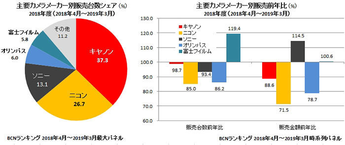 위 자료(일본 내수 판매량 기준이며, 전 세계 판매량에 대한 기준이 아니다. 기간 또한 2018년과 2019년에 걸쳐 1년이라는 기간이다. 최근 카메라 시장 통계 자료라는 점에서 선택했지만, 각 제조사의 신제품 출시 시기 등의 영향이 일정 작용할 개연성이 크고 따라서 전체 시장의 흐름에 대한 참고 정도로 생각하자) 판매량 기준 1위 캐논은 전기 대비 카메라 판매 수의 변화는 거의 없지만, 매출액이 11.4% 감소하였는데, 아마도 카메라 시장 침체에 대응하고 판매 1위를 고수하기 위한 할인 판매 등의 영업 비용 증가 요인 영향으로 생각된다. 판매량 기준 2위 니콘의 부진이 크게 눈에 띄는데, 타 회사에 인수 합병설(후지필름에 의한 인수설, 해외 매각설) 등이 공공연히 회자될 정도로 어두운 전망 탓인지 (디지털 미러리스 카메라(Z 시리즈)를 출시하며 반등을 노렸음에도 불구하고) 다시 큰 폭의 하락세를 보이며, 향후 니콘의 전망이 더 어려워 보인다. 3위에 위치한 소니는 전체 판매대수는 6.6% 감소하였으나 매출액은 14.5% 증가하였는데, 이는 콤팩트 카메라의 판매량 중심에서 중/고가 제품의 판매로 변화된 것이 원인이지 싶다. 그나마 4위 후지 필름의 판매 대수 증가가 19.4%로 눈에 띄지만, (당시 인스탁? 등의 즉석 인화지 + 디지털 사진 등의 제품 출시 영향 등을 감안하여야 할 듯하고) 전체 시장 규모에서 비중이 5.8% 정도이고, 매출액의 변화는 전기 대비 거의 없었다. (0.6%) 올림푸스와 파나소닉은 위 자료에서도 기타로 분류될 정도이니 따로 언급하지 않아도 되지 싶다.