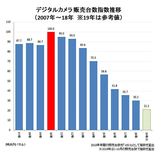 디지털카메라 시장에서의 판매량, 매출액 추이 등 자료에서도 (디지털 미러리스 카메라의 약진에도 불구하고) 카메라 시장의 하락세는 수년간 지속적이고 뚜렷하고, 최근에도 년간 판매 대수 하락은 20% 초반대 수준을 보인다.