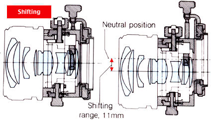 일반적인 렌즈가 광축과 평행하게 구성 요소 군이 전후로 이동하며 초점 조절(focusing)만 가능한 구조로 이루어져 초점 조절에도 촬상면과 광축은 직각을 유지하며 전후의 이동만 가능한 반면, PC(원근 제어) 렌즈 (쉬프트 렌즈)는 광축을 중심으로 좌우(또는 90도 회전하여 상하) 방향으로 촬상면을 평행 이동하여 촬영하는 물체들의 원근(촬영거리의 차이)에 따른 왜곡 표현을 제어할 수 있다.