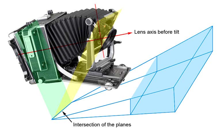 틸팅-Tilting (또는 회전하여 Swing)은 직각을 이루는 광축과 촬상면에서 기울임을 통해 초점이 맞는 범위(피사계 심도)를 실제 사물이 놓여 있는 공간의 배치 구도에 따라 조절하는 방식을 통해, 촬상면 일부에 초점이 맞는 영역을 좁게 표현되도록 하거나 반대로 넓은 면에 초점이 맞도록 제어할 수 있다. 이는 단순히 조리계를 조여서 광축과 수직이 되는 면에서 앞/뒤 영역에서 피사계 심도의 정도/깊이를 조절하는 것과 달리, 설정한 기울기 방향으로 초점이 맞는 영역(초점면)이 표현/묘사되도록 제어 가능하다.