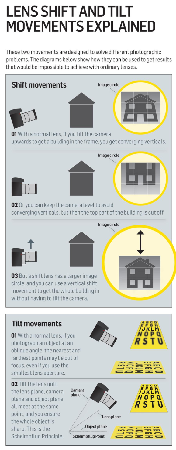 원근 제어 렌즈나 틸트 & 쉬프트 효과는 대형 뷰카메라에서는 주요 기능으로 다루어지고 이를 활용한 촬영기법이 잘 정리되어 있어서 이를 통해 이해하는 것이 더 효과적이라 생각한다. (뷰카메라의 무브먼트, 그리고 PC 또는 틸트 쉬프트와 관련한 자세한 설명은 웹에 좋은 자료가 많고, 더 잘 설명할 지식이 없다. 따라서 기본적인 이동은 뷰카메라의 방식을 참고할 수 있는 이미지와 효과를 시각적으로 간명하게 설명하는 이미지로 대신하자. 상세한 내용은 각자의 검색/구글링을 추천한다)