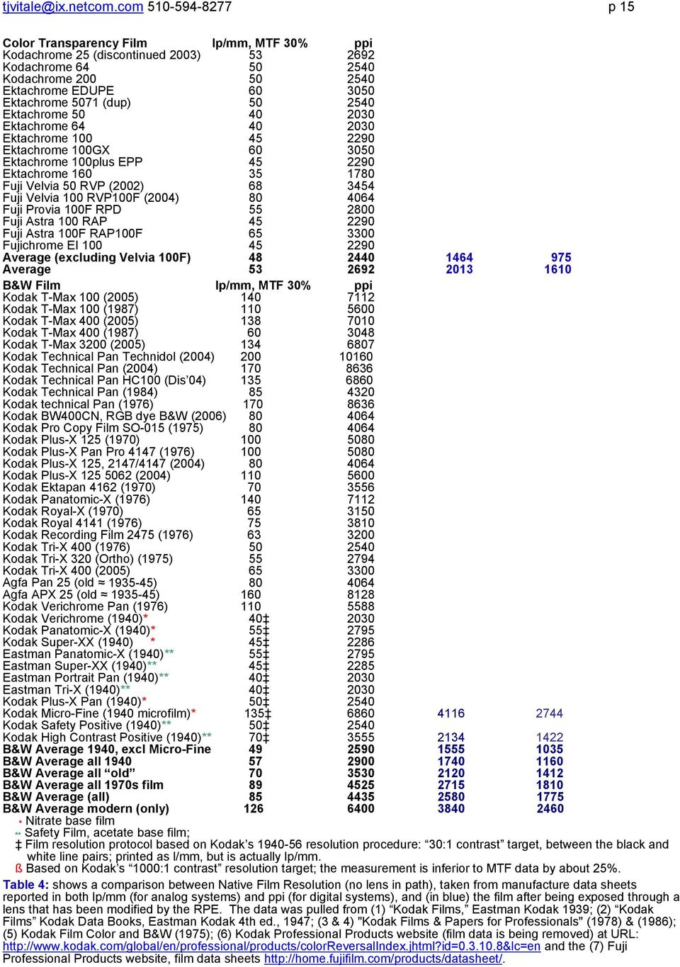 아래는 상용 필름으로 널리 사용되었던 주요 필름 제조사의 제품별 필름 해상력에 대한 자료인데, 영문으로 된 전문 자료라서 내용 자체를 완전히 이해할 필요까지 없겠지만, 어느 정도 참고하는 데는 도움이 되지 싶어서 첨부했다. 해상력과 해상도에 대한 정의와 개념 또한 이전 포스팅의 링크로 대신하자.