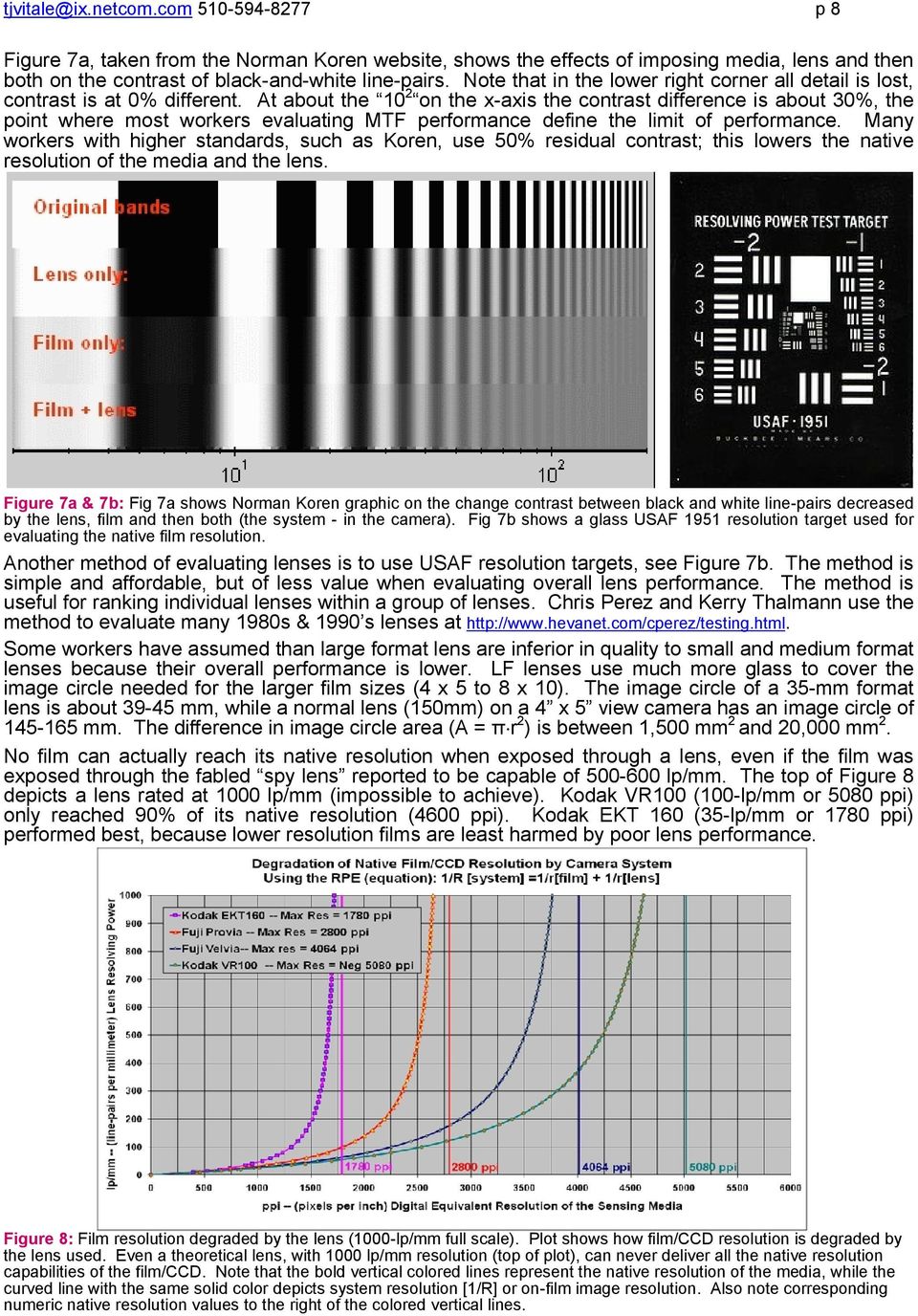이를 풀어서 다시 설명하면 명도차가 큰 명암비(일례로1000:1 정도)의 흑과 백의 패턴을 구분할 수 있는 '해상도'의 개념보다 상대적으로 명도 차가 크지 않은 실제 촬영의 조건에서 두 상 경계면을 뚜렷하게 구분하는 척도로서 '선예도'가 필름의 실용적인 성능/품질을 비교하는데 더 부합한다고 할 것이다. 디지털 이미지에서와 달리 필름의 해상도 수치는 필름의 광학적/물리적 특성을 나타내는 많은 지표 중의 한 요소라고 생각한다. 따라서 필름의 성능이나 질의 평가에서 해상력 또는 결과물의 해상도에만 너무 과몰입할 필요는 없다. 디지털 이미지에서 성능/화질 비교에서 효용이 높은 '해상도'의 개념이 거꾸로 그럼 필름에서는 어떤가?로 전이된 것에 불과하다. 광화학 반응의 결과물로서 필름과 인화물, 그리고 아날로그 화상 신호와 이를 기반으로 한 디지털 화상 신호 각각의 특징과 차이에 대해 고민해 볼 필요가 있다.
