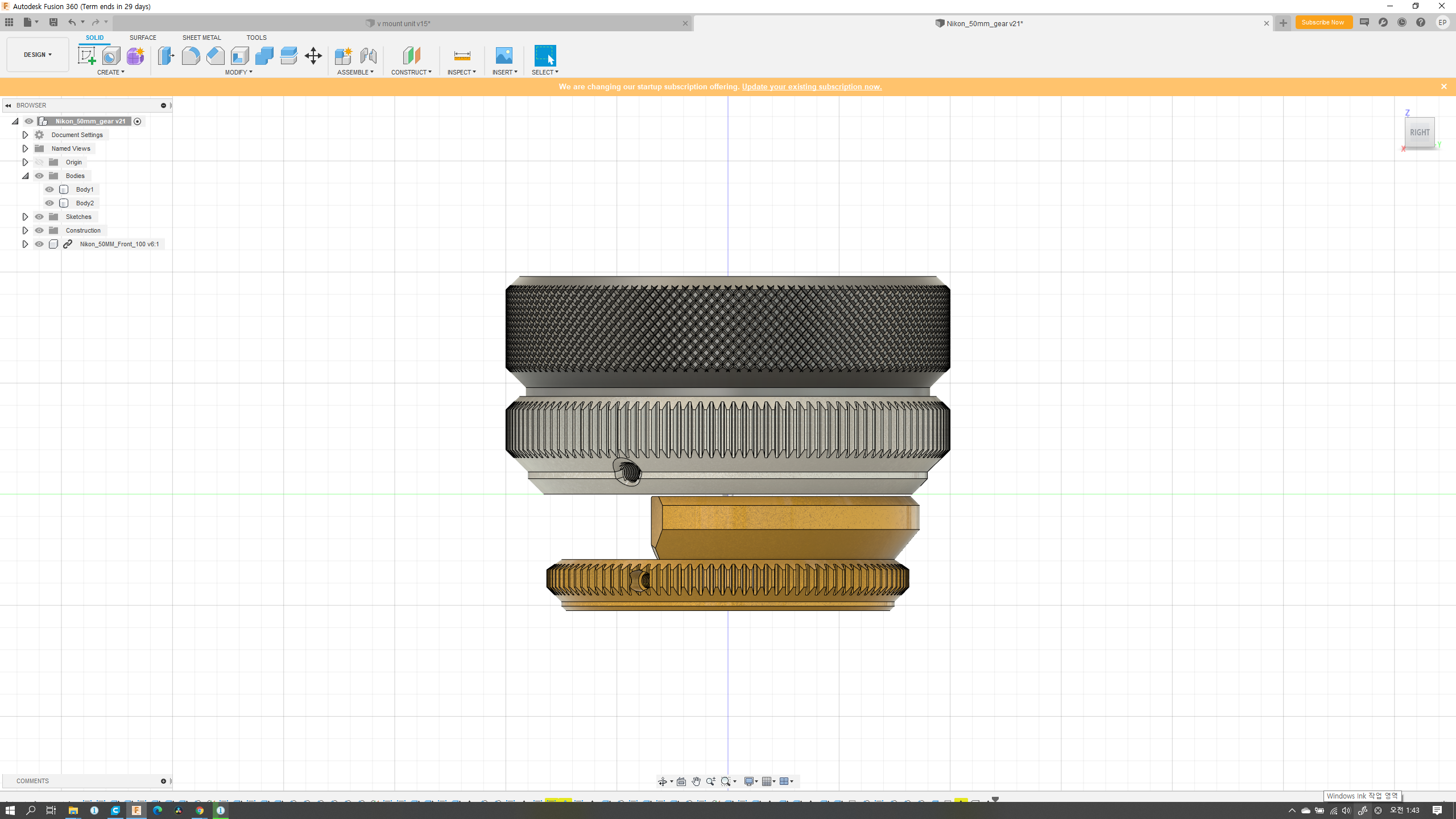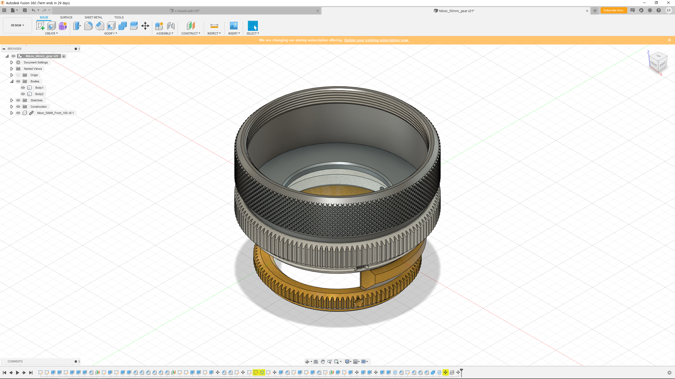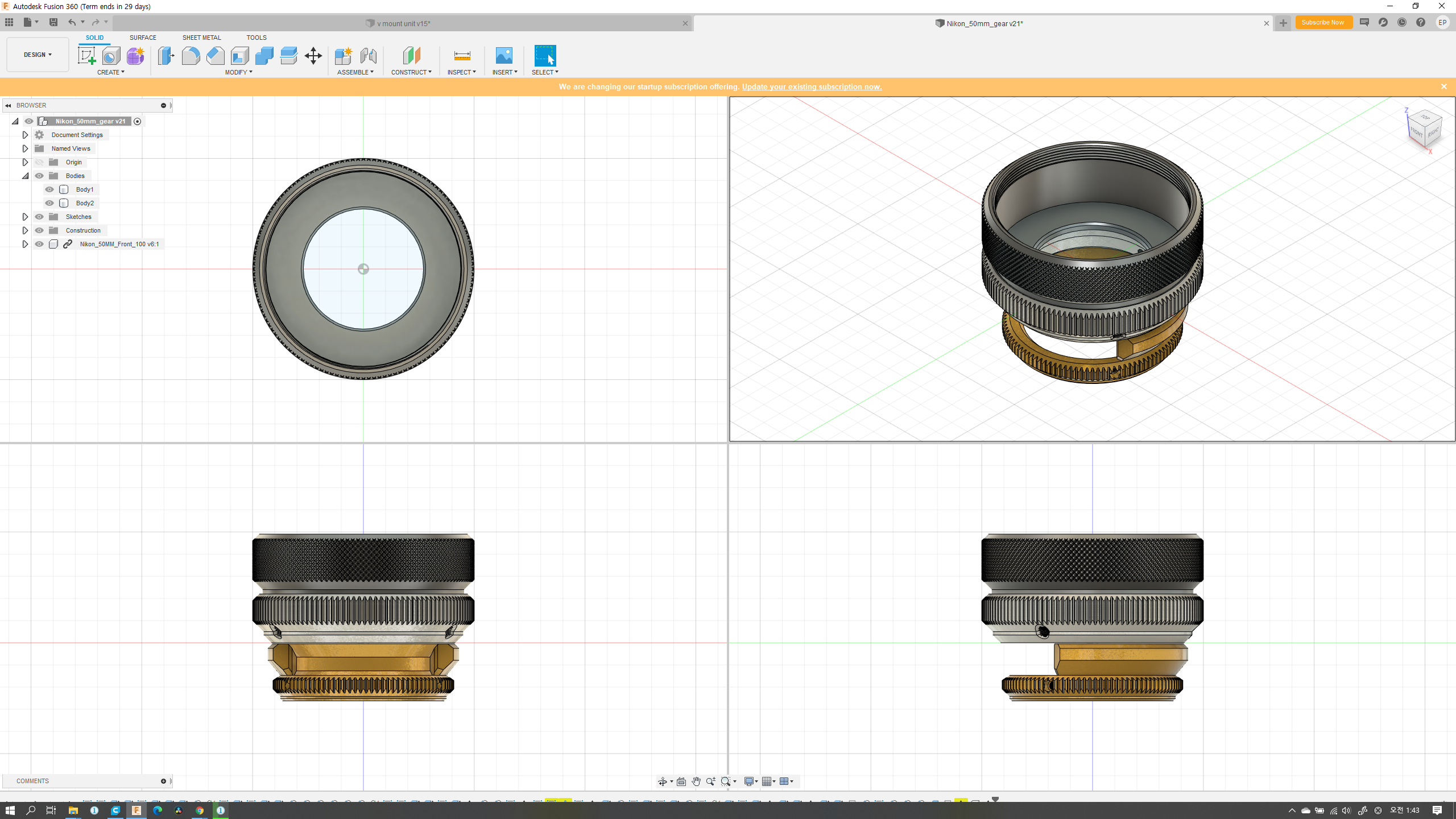 두 달여 전 즈음에 니콘 50mm f1.4 커스텀 하우징을 만들었는데, 디자인이 너무 투박하고, 검은색 PLA의 유광 마감이 성에 차지 않았다. 아쉬운 부분을 개선해서 완전 다른 구조로 다시 모델링했고,
