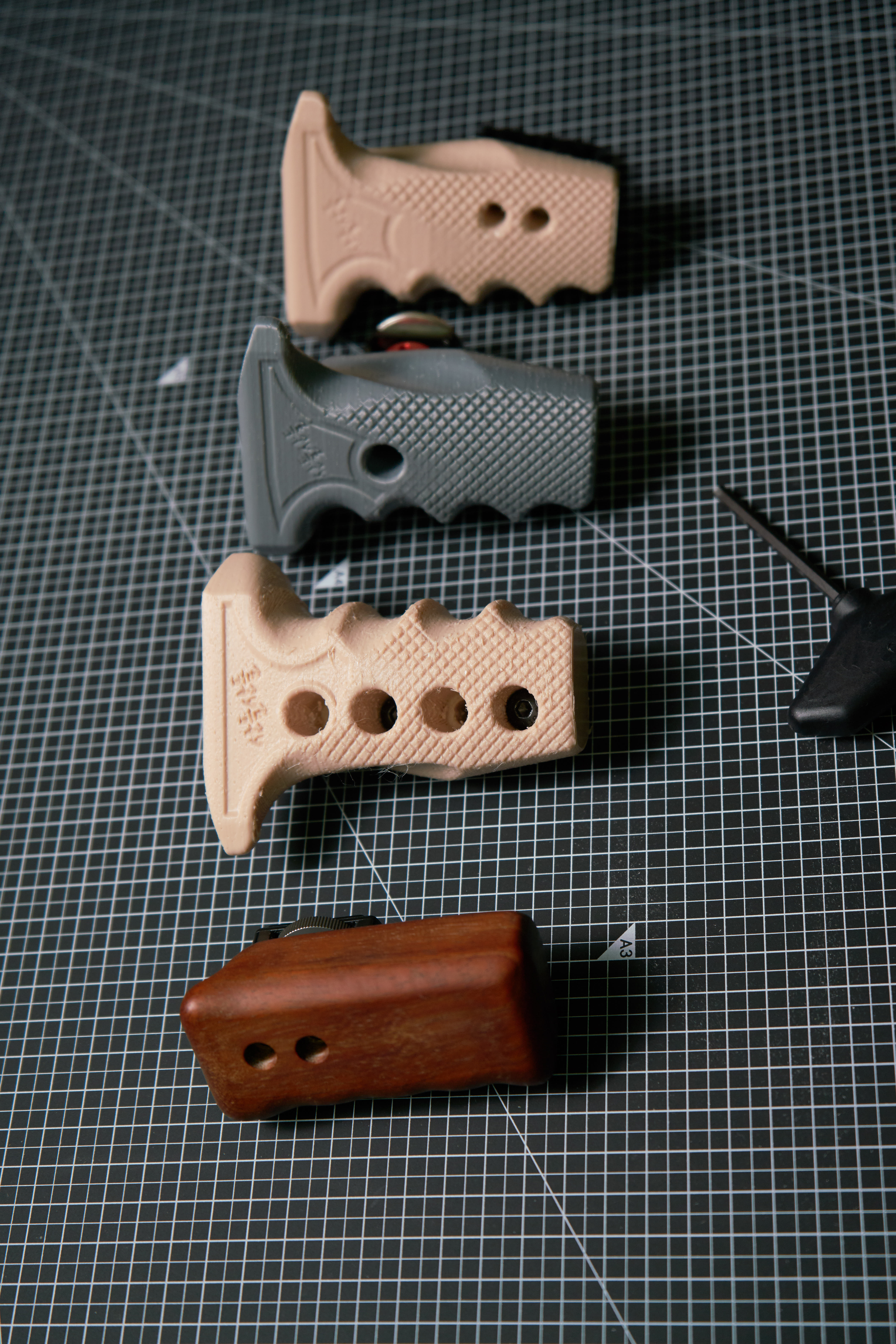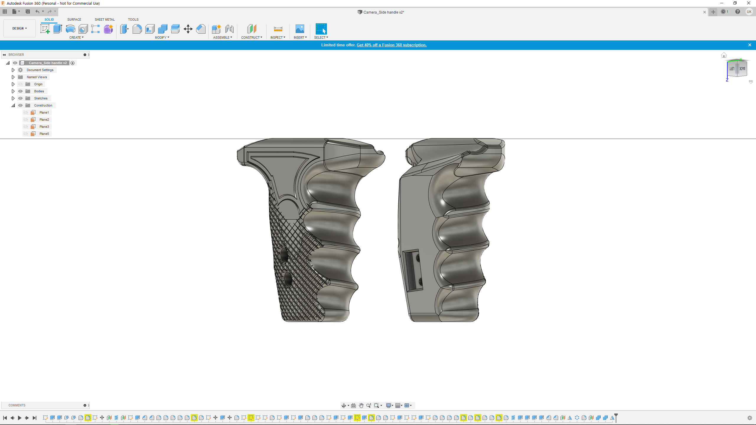 잡기 쉽고 안정적이며 가벼워서 사용하기 쉬운 카메라 측면 손잡이를 만들고 싶었습니다. 인체 공학적 디자인에 익숙하지 않아 손으로 잡기 편한 형태로 여러 번 수정한 후 핸들 그립을 디자인해야 했습니다.