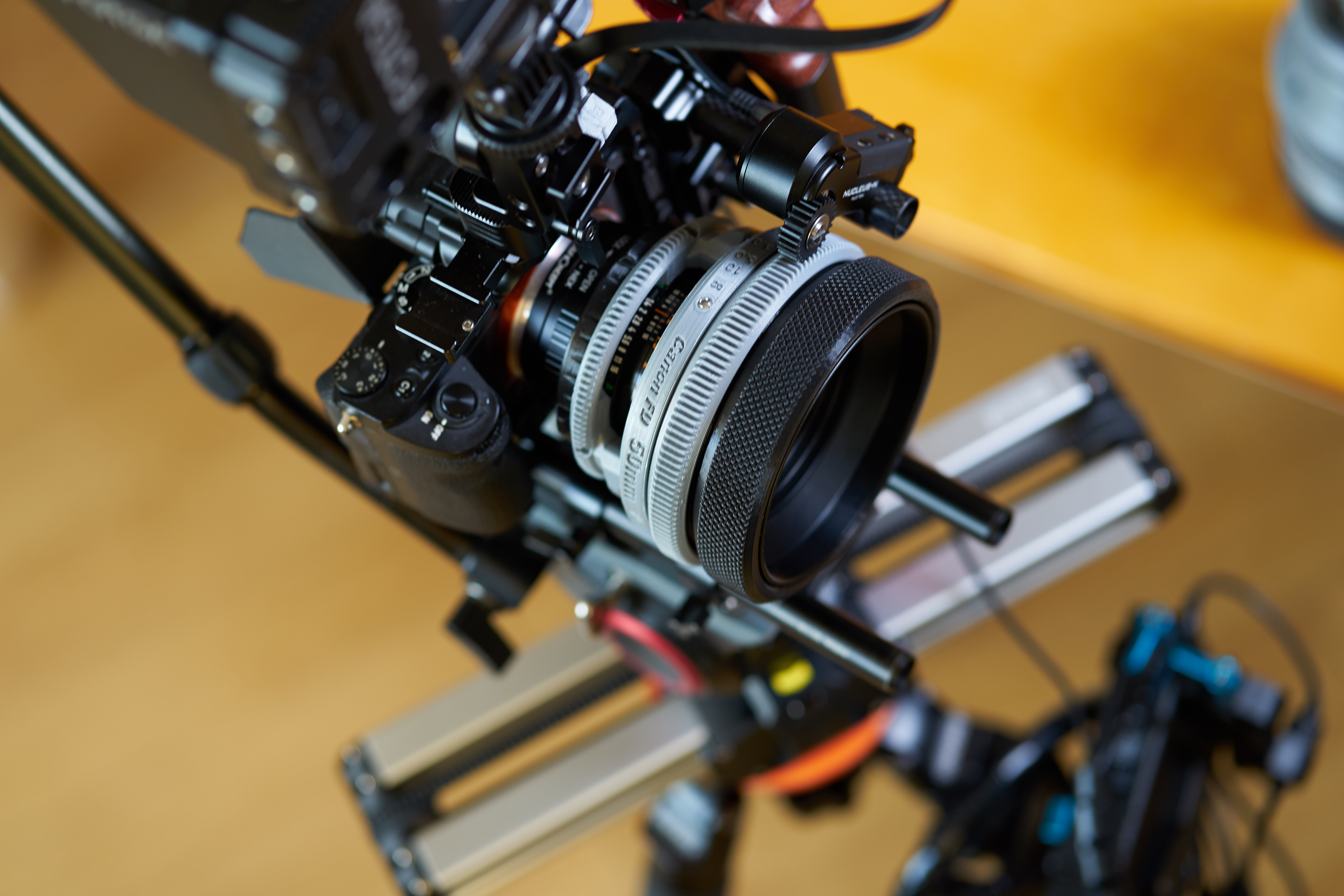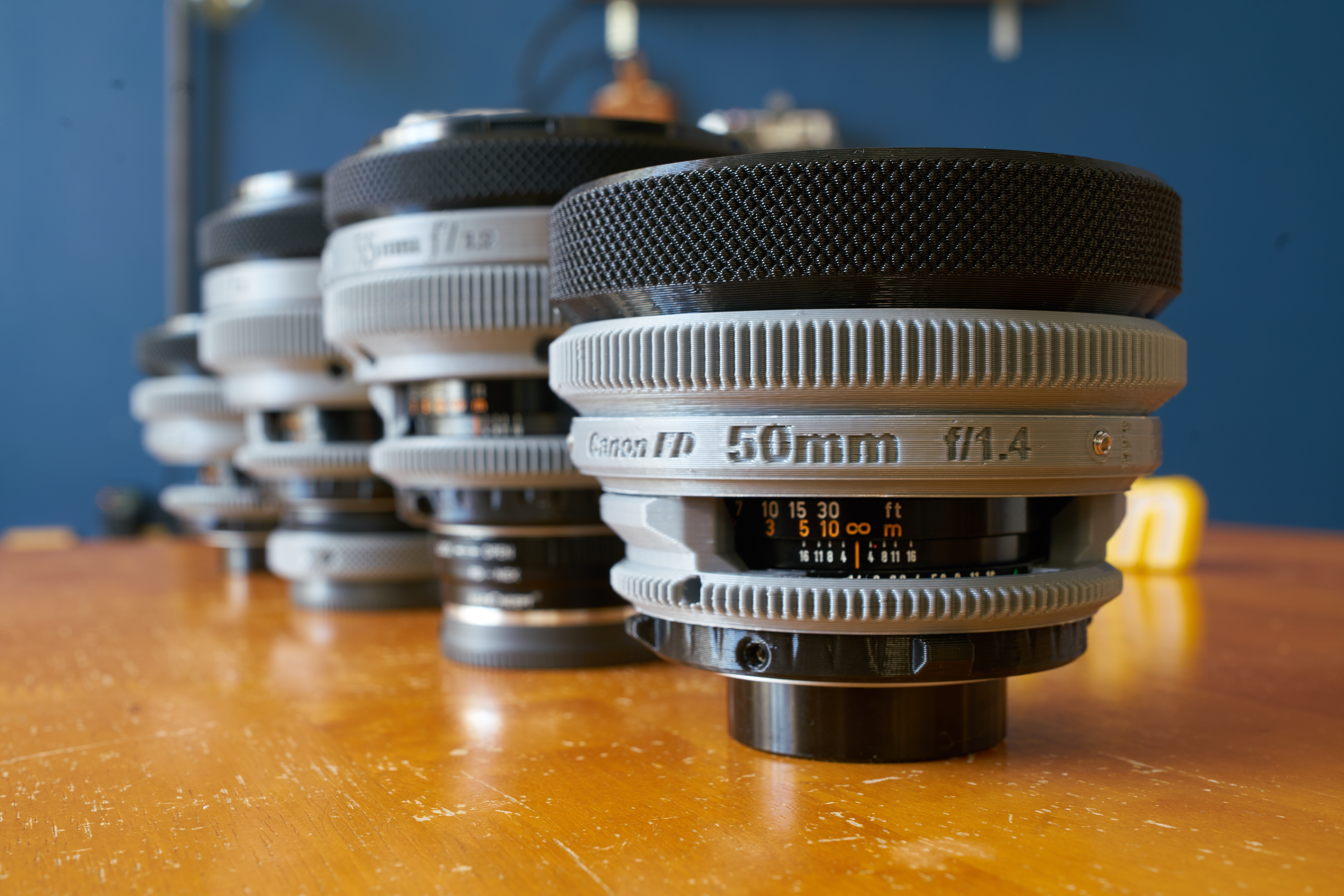 This custom lens re-housing is optimized for "Canon FD 50mm f / 1.4 S.S.C". I wanted to create a set of lenses that pay homage to the k35 Cine Prime. The k35 Cine Prime shares most of its optical design with Canon FD lenses, so I tried to accommodate the C