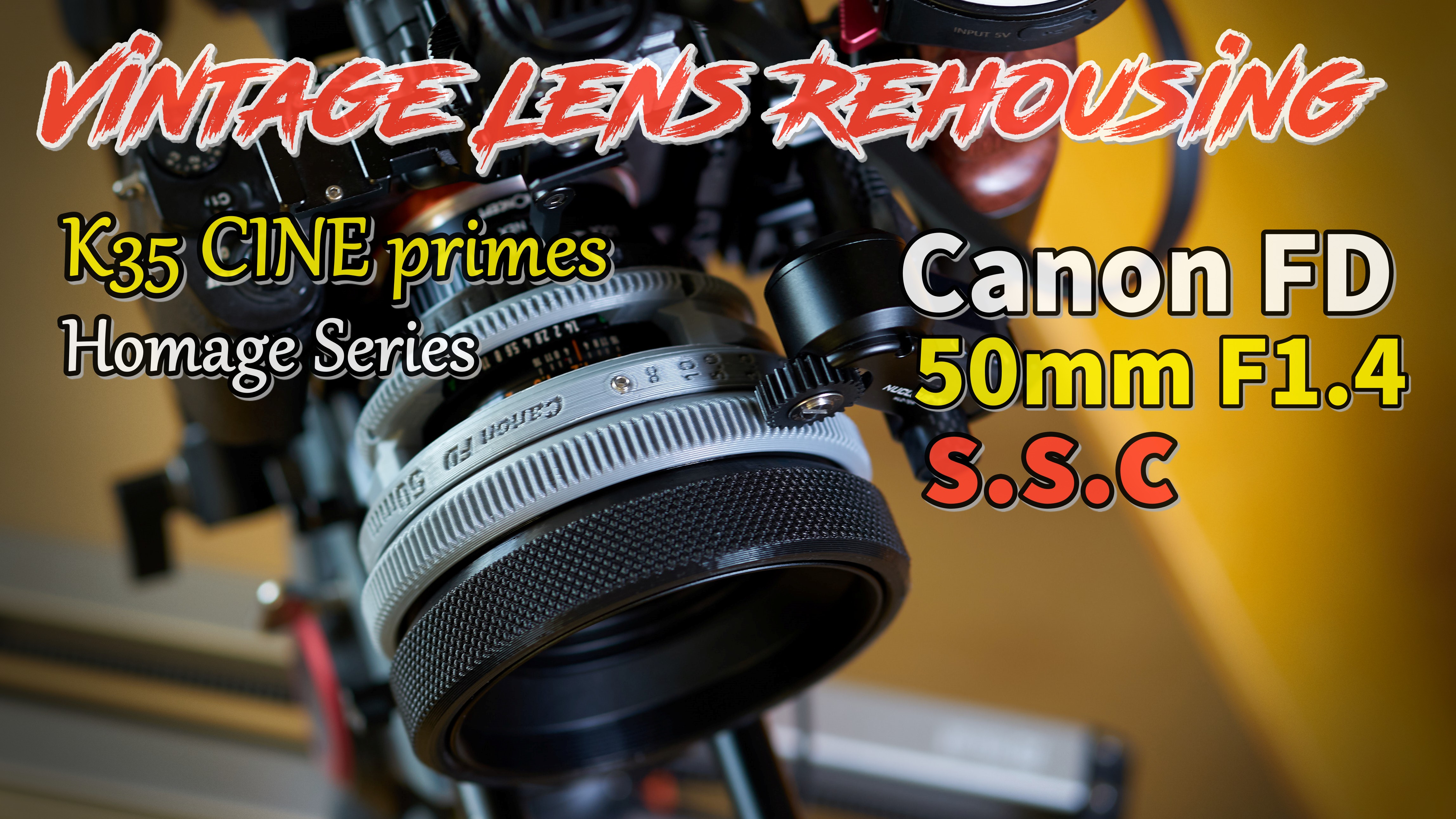 Canon FD 50mm f1.4 S.S.C Vintage still lens to CINE Rehousing - "K35 CINE primes Homage"이 맞춤형 렌즈 리 하우징은 "Canon FD 50mm f / 1.4 S.S.C"에 최적화되어 있습니다.