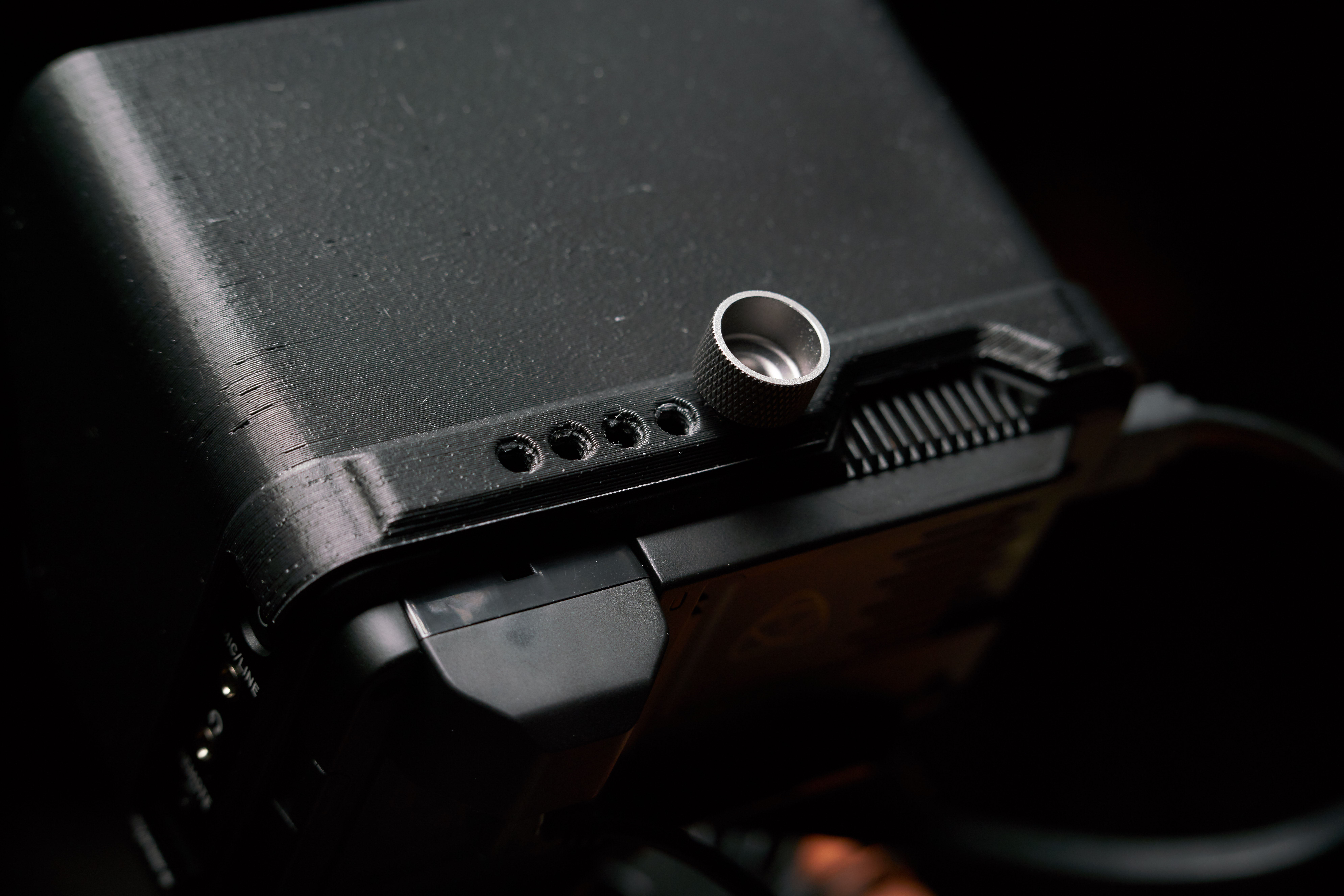 Ninja V의 외형과 상하 4 개의 홈에 맞도록 설계되어 후드 탈부착이 용이합니다. 후드를 견고하게 고정하려면 상단의 1/4 나사 홈을 사용하여 고정할 수 있도록 디자인 되었습니다.