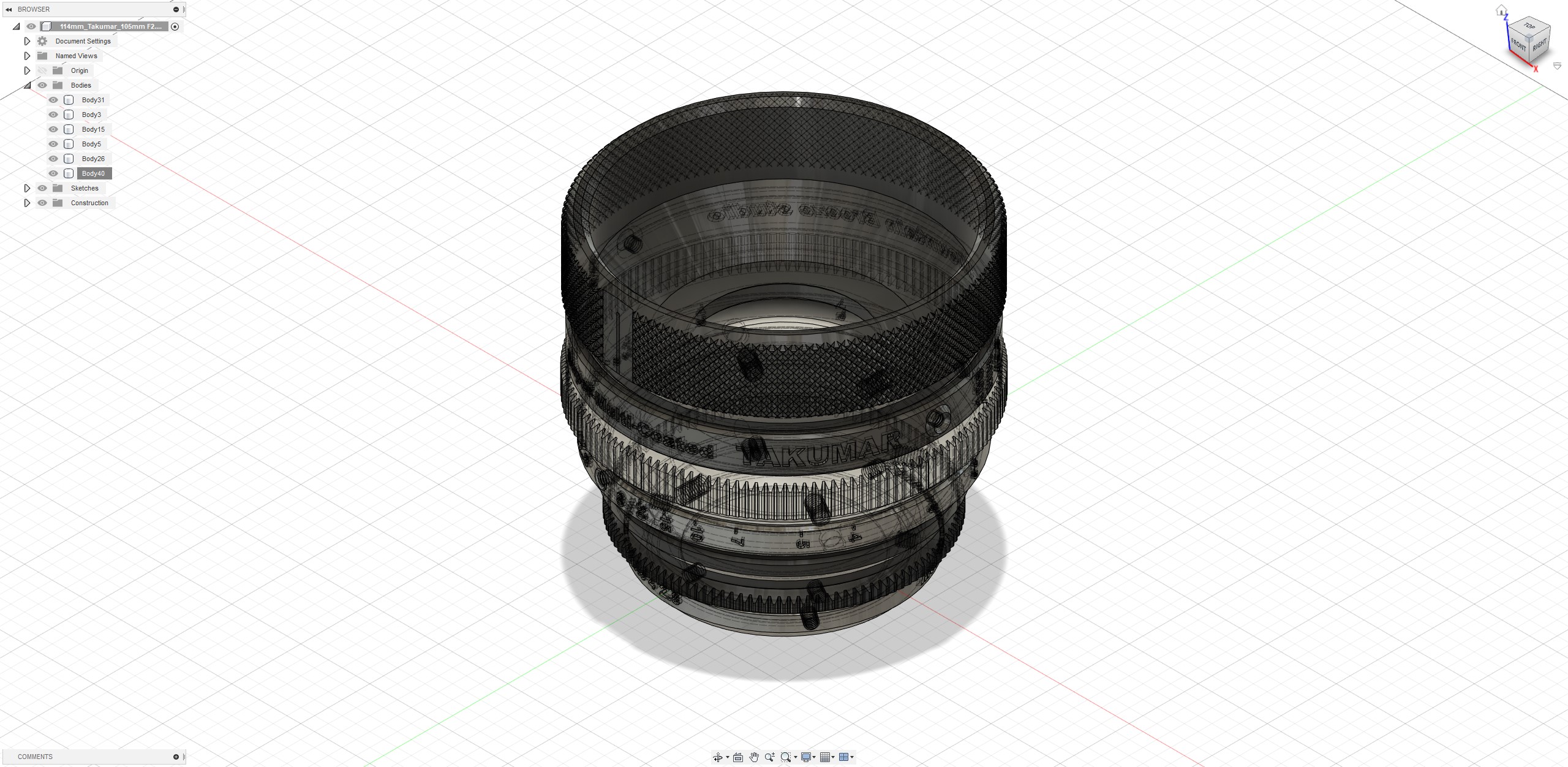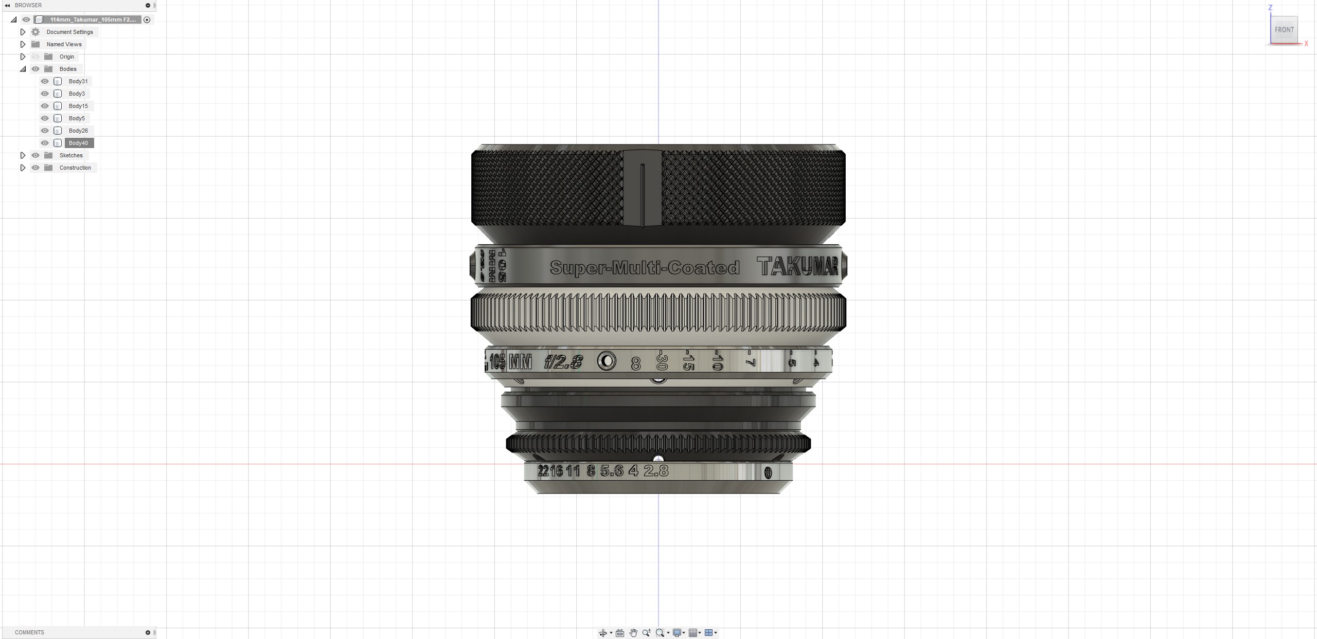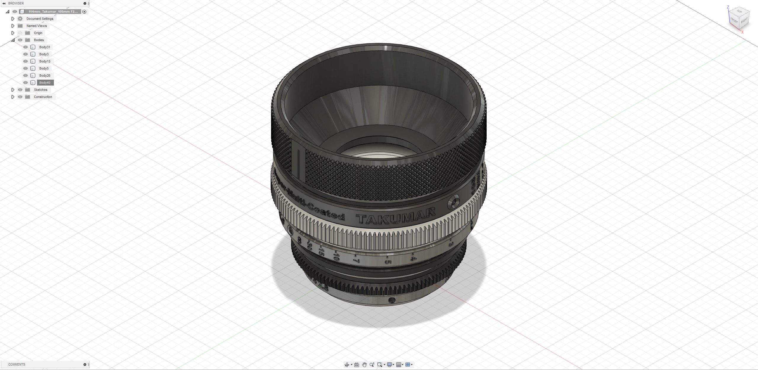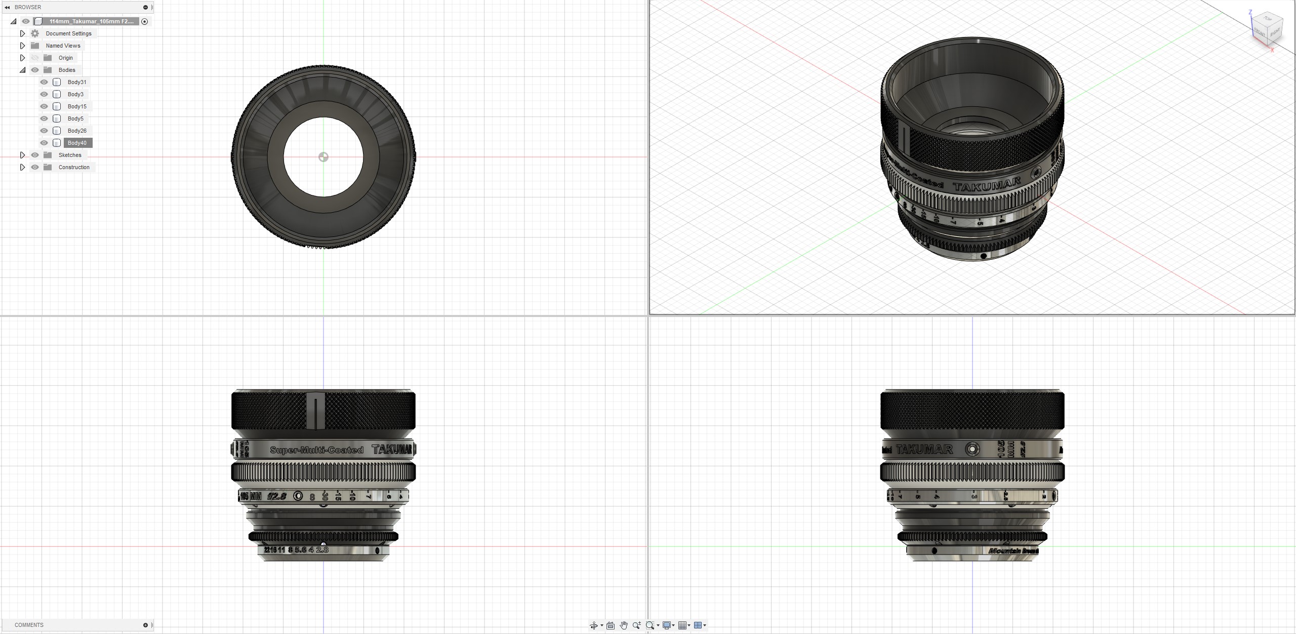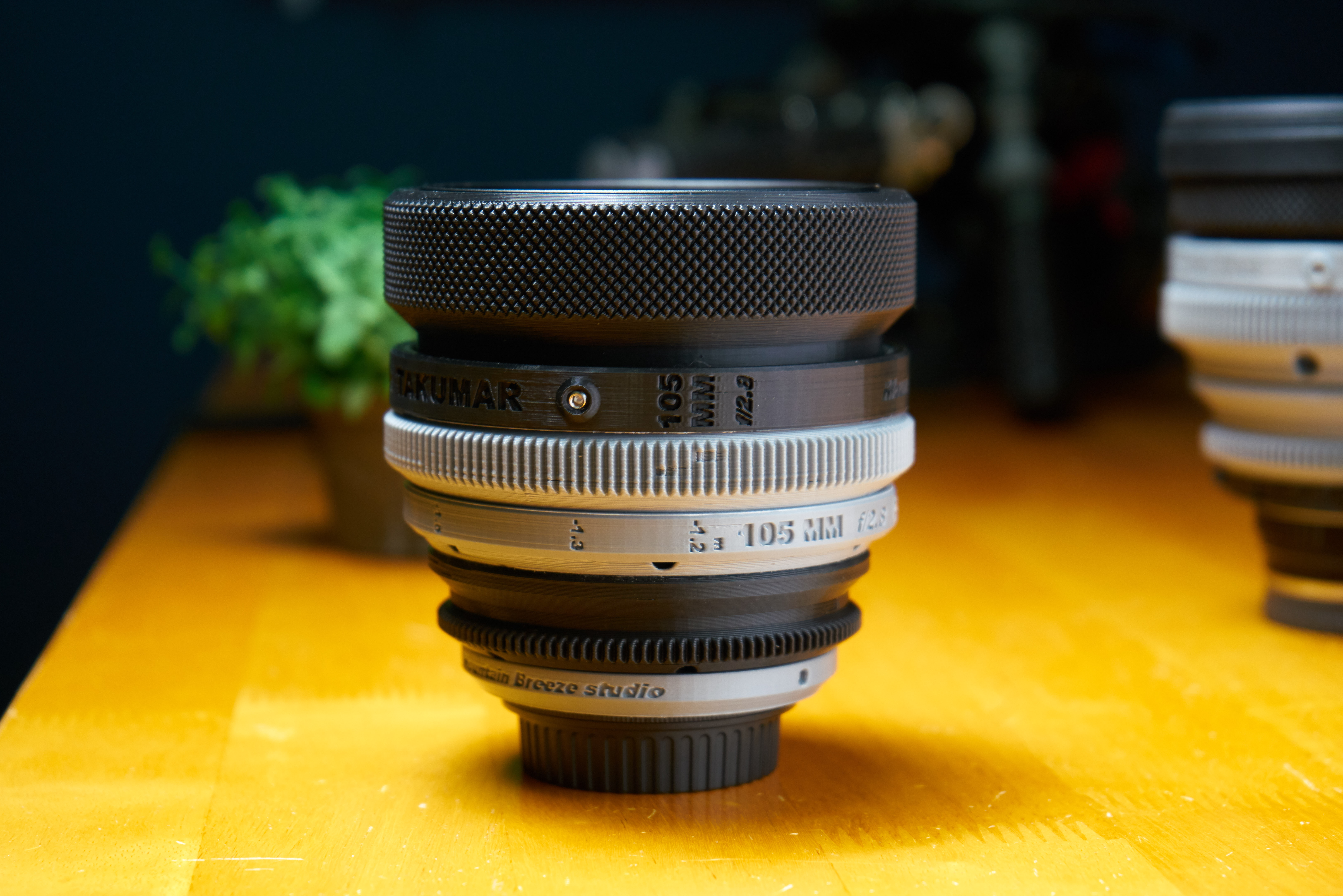 영상 촬영을 위해 구형 SLR 카메라의 MF 렌즈 (Super-Multi-Coated Takumar 105mm f / 2.8)를 개선 한 Cinematic 렌즈 하우징입니다. 또한 다른 시네마 렌즈와 유사한 포커스 기어 사양을 유지하고자했기 때문에 포커스 기어의 외경은 114mm와 141 개의 톱니로 구성되었습니다.