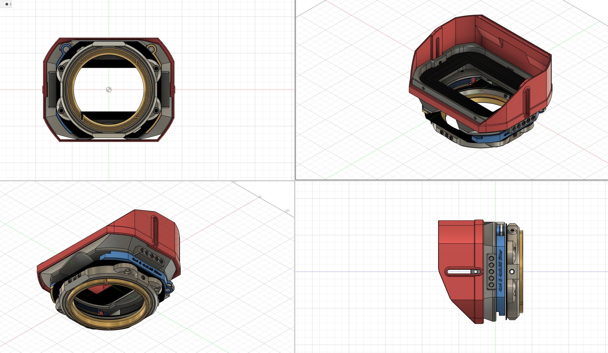 Mattbox의 프랜치 플래그는 탈부착이 매우 번거롭고 부피가 너무 커서 한 명의 동영상 제작자가 사용하기 어려워서 이를 개선하고자 앞 뒤로 이동 및 고정할 수있는 후드 형태로 설계되었습니다. 후드의 길이는 렌즈의 초점 거리, 휴대 또는 보관 시, 촬영 시 빛을 차단해야 할 때 적절하게 조정할 수 있습니다. (쉐이딩 효과가 큰 고정 후드 방식도 추가했지만 너무 커서 휴대 및 보관이 불편해서 실제로 인쇄되지는 않았습니다.)