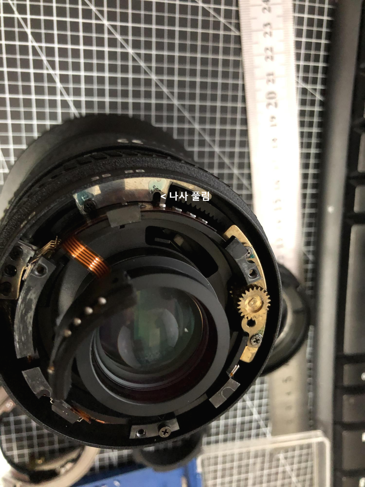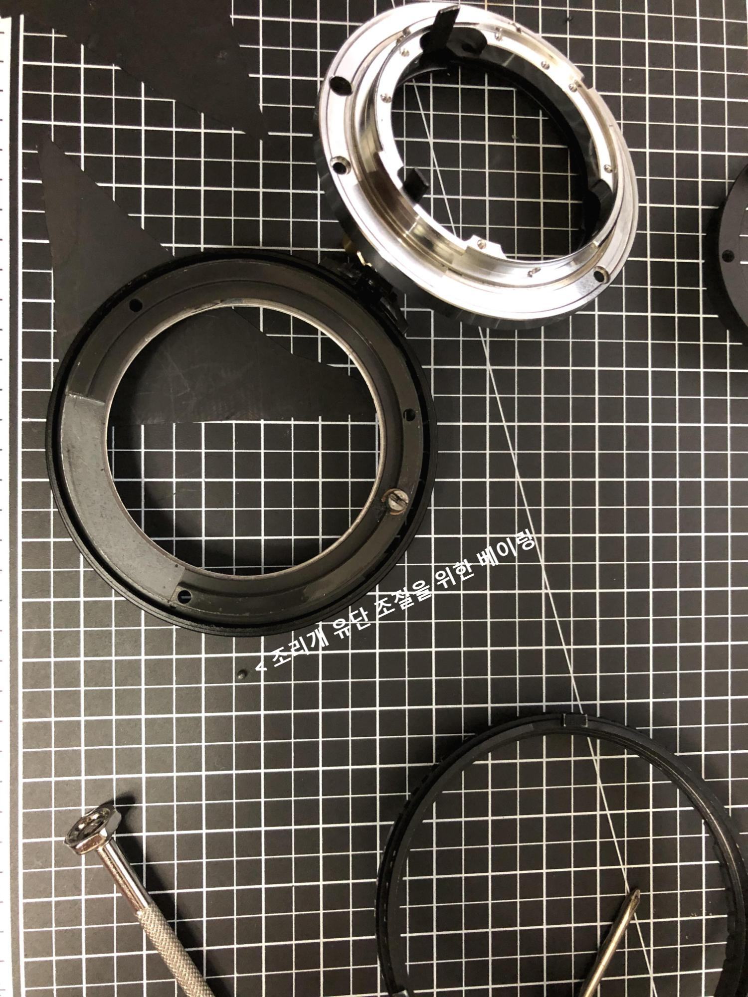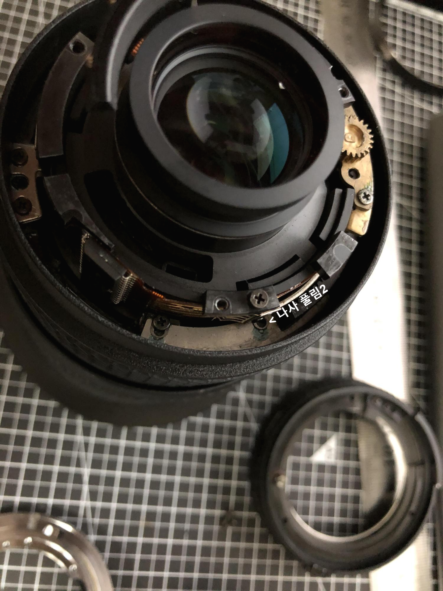 이왕 수리를 위해 분리를 했으므로, 영상용에 알맞게 무단 조리개 (Stepless or de-clicked)로 사용하기 위해 렌즈 조리개 장치에서 작은 베어링을 제거했다. (수동 초점 전용의 렌즈 또는 니콘 D 타입 렌즈까지만 가능하고, 근래의 G 타입 등은 렌즈에 조리개 조작 링이 없으므로 가능하지 않다)