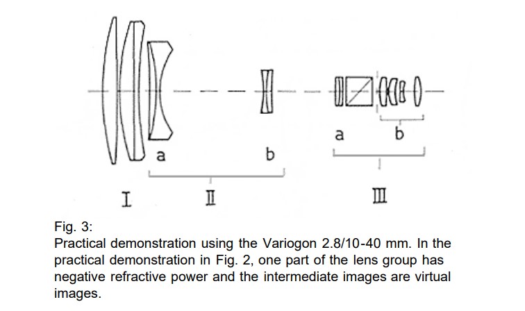 전통적인 건축 유형의 Variogon 설계 원리는 이해하기 쉽습니다. 필수적인 요소는 이미지가 필름에 직접 투영되지 않고 여러 중간 가상 이미지가 생성된 후에야 도착한다는 것입니다. 첫 번째 렌즈 그룹은 다른 렌즈와 마찬가지로 피사체의 이미지를 만듭니다. 광학 시스템의 이 부분만 일반적으로 일반적으로 전체 렌즈가 아닌 피사체와의 거리에 맞게 조정됩니다. 이 첫 번째 이미지에서 두 번째 렌즈 요소 그룹이 두 번째 이미지를 생성합니다. 최종 이미지를 생성하는 것은 렌즈 요소의 세 번째 그룹 일뿐입니다.