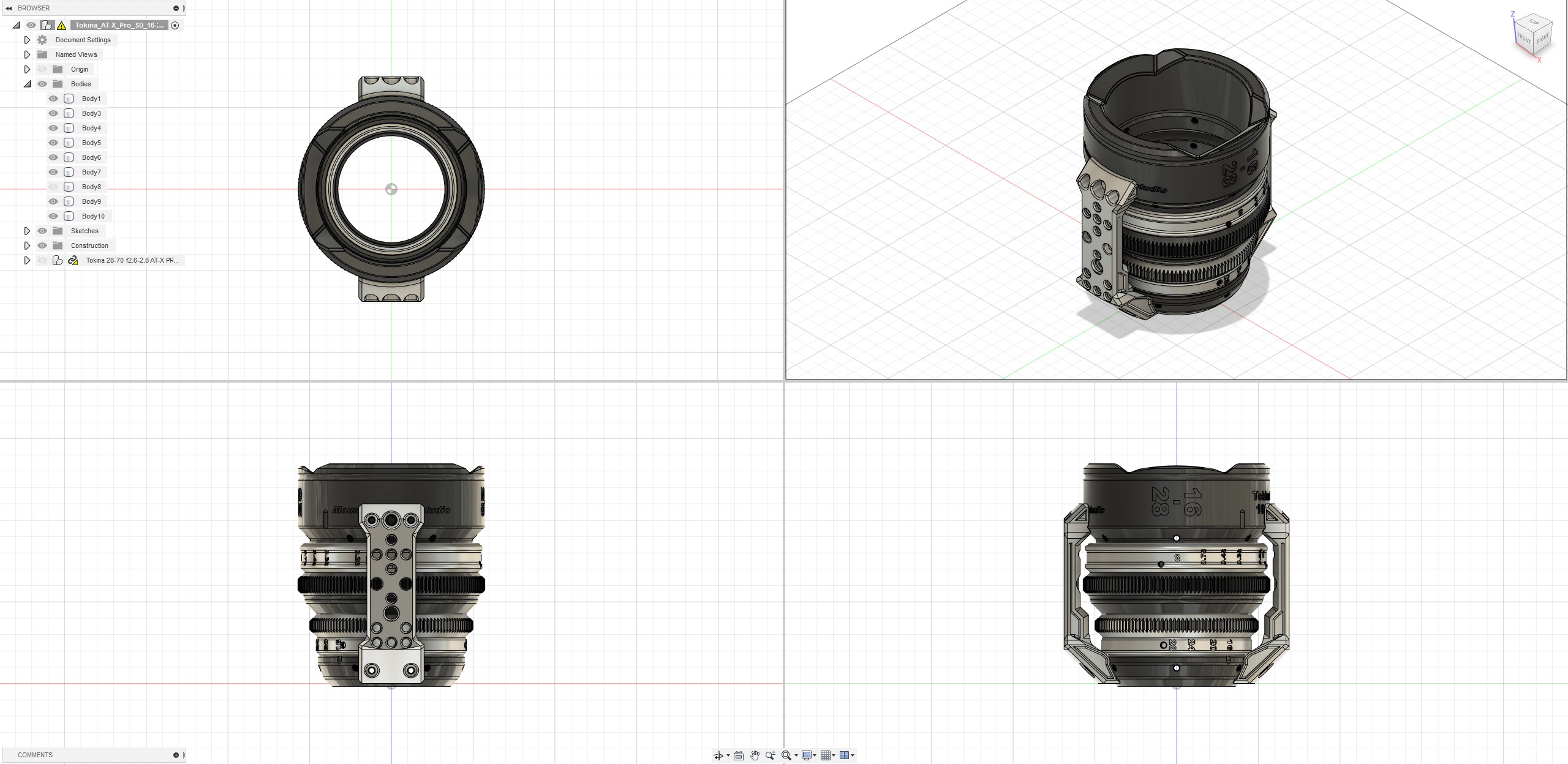 전면에 후드가 고정되어있어 렌즈의 원래 형태를 유지하면 렌즈 하우징을 안정적으로 고정하는데 많은 어려움이있었습니다. 렌즈 전면과 후면을 안정적으로 고정하기 위해 렌즈 전면과 후면을 연결하는 두 개의 대칭 지지대가 있는 구조로 설계되었습니다. 또한 서포터에 다양한 액세서리, 손잡이, 삼각대를 부착하여 활용도를 높일 수 있도록 설계되었습니다.
