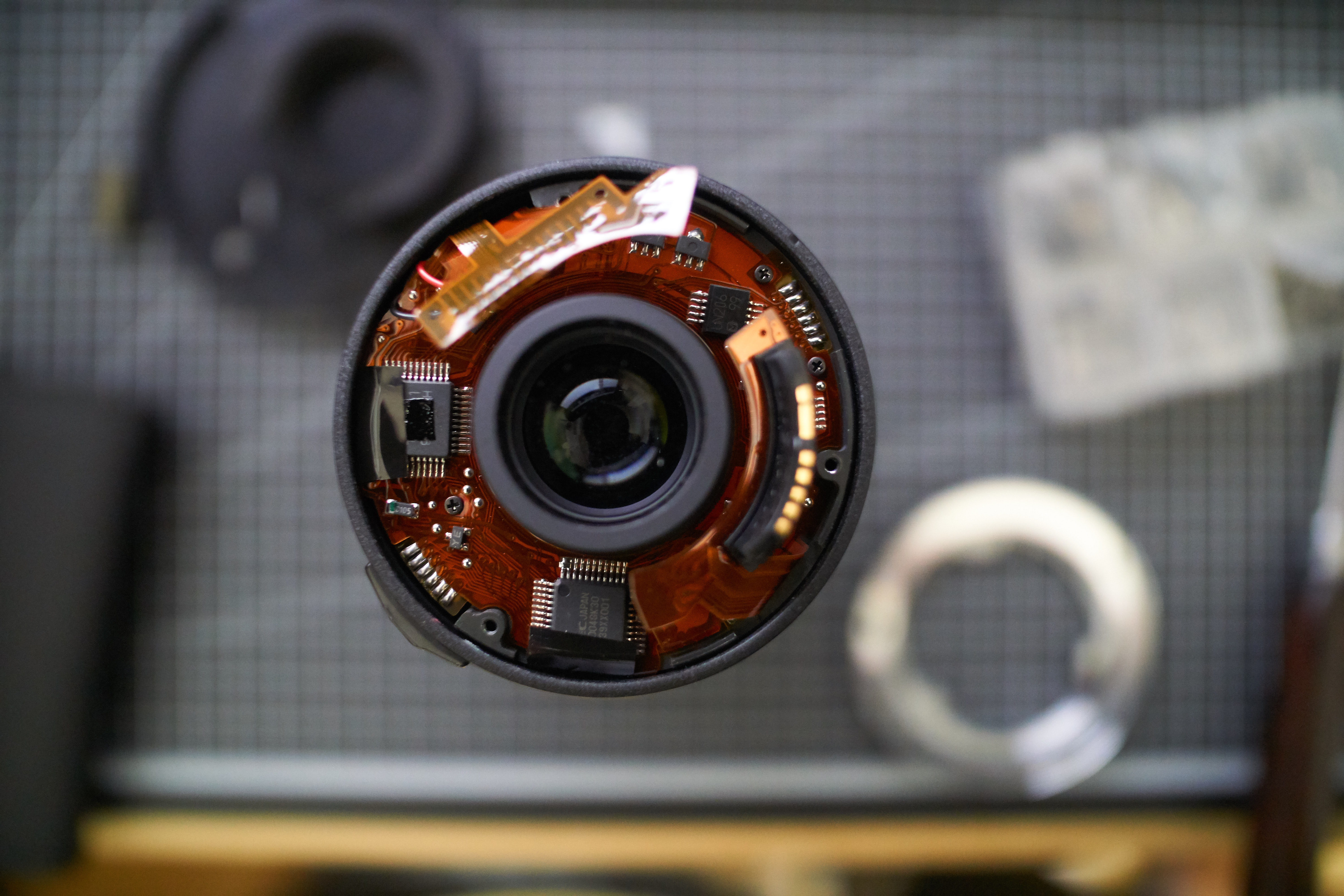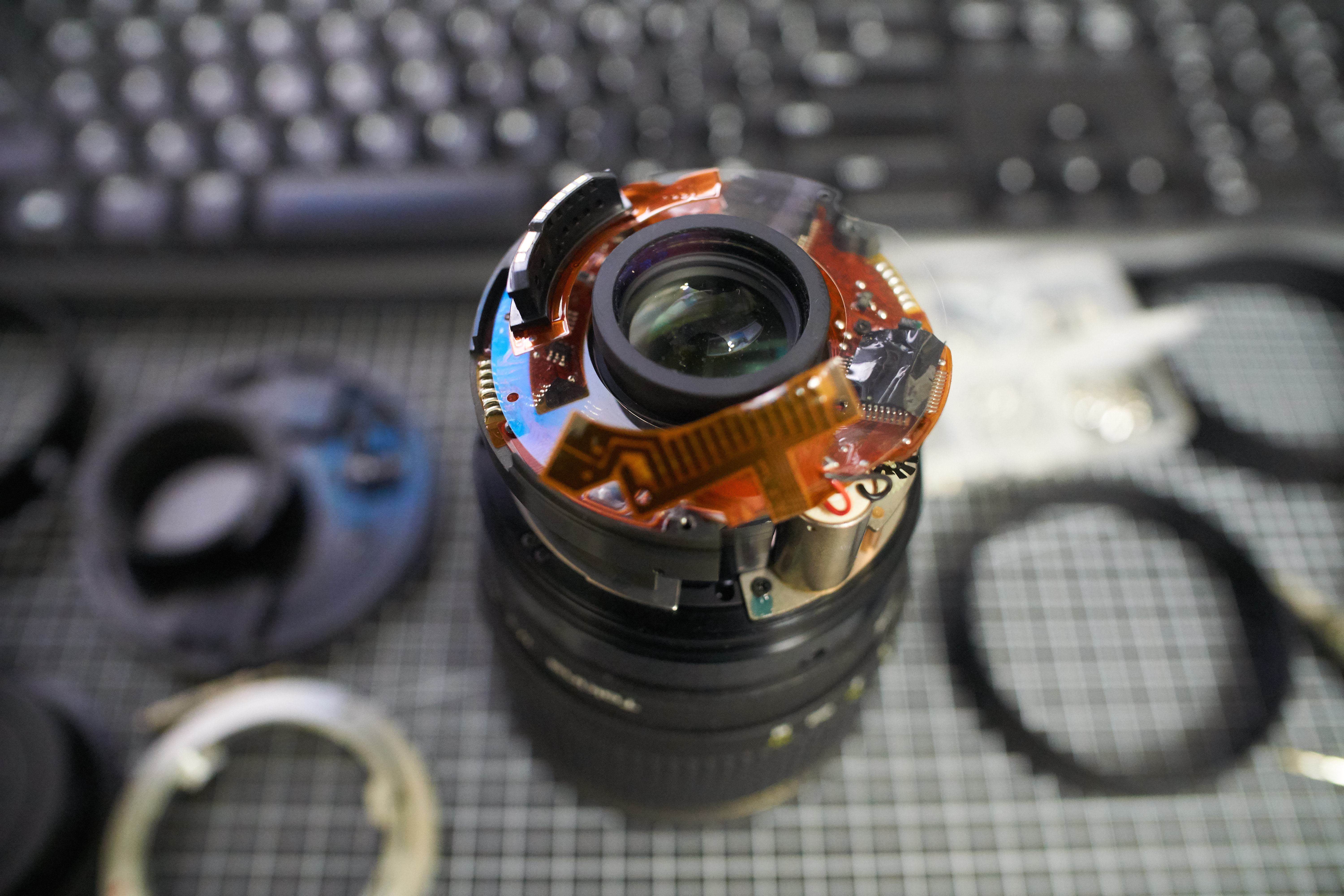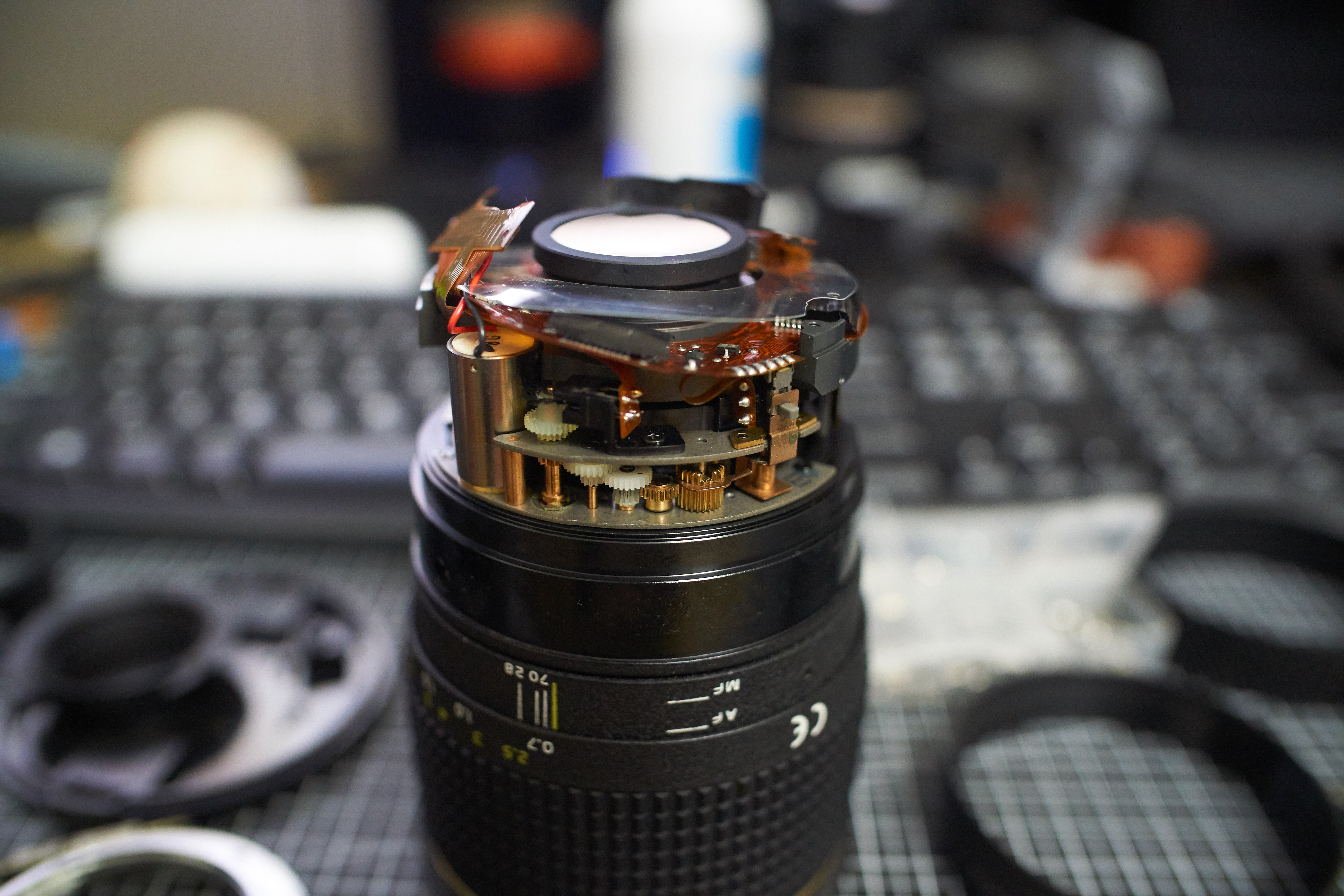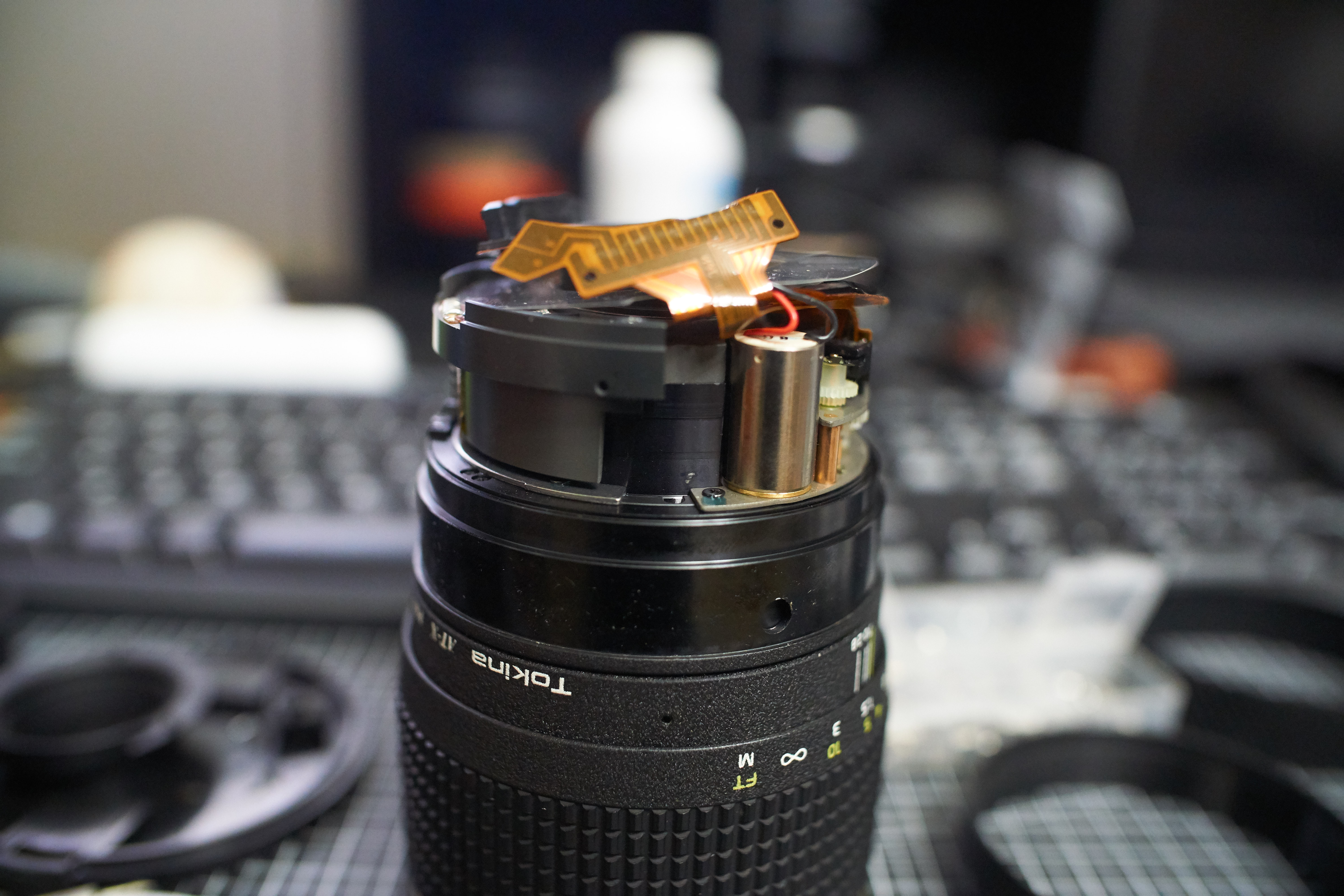 구동 장치와 관련한 내부 구조가 궁금해서 마운트 방향에서 분해해 보았다. 내부는 포커싱과 조리개의 제어를 위한 전자회로와 모터 기어박스, 그리고 렌즈의 거리 정보를 생성하기 위한 회로 등으로 구성되었고, 상태는 깨끗하고 별다른 이상 증상이 없었다. 90년대의 AF 렌즈들은 주로 DC 모터 기어박스에 의해 AF가 구동되는 구조이고, (토키나는 여전히 이 방식을 고집해서, AF 구동 시 소음이 조금 크지만, DC 모터 방식의 장단점-주로 가성비와 관련해서-도 있으니 나쁜 방식이라고만 생각하지는 않는다) 힘차고 빠른 AF 구동 성능을 보여주지만, 그만큼 특유의 소음이 발생해서 시끄럽다. 상대적으로 비교하자면, 캐논에서 울트라 소닉 등의 명칭을 붙여 초음파 모터 방식(USM) 그리고 2000년 이후 시그마의 HSM 등이 적용되어 모터와 기어 장치의 시끄러운 구동 소리를 줄여주지만, 이 또한 상대적으로 조금 더 조용할 뿐이고, AF 구동 속도나 토크 면에서 DC 모터와 기어박스가 조금 나은 느낌도 있다. 간단히 먼지 등을 제거하고 다시 조립했다.