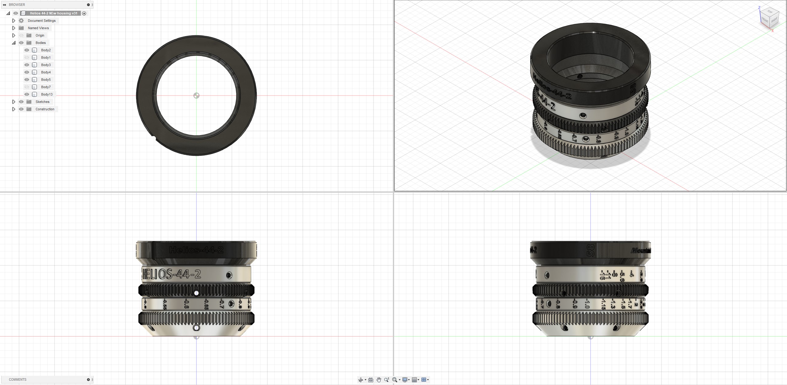 이전 동영상에서 공유 한 Helios-44-2의 EF 마운트 용 업그레이드 하우징과 비교하여 후면 및 전면 부품이 변경되었습니다. 초점 링 및 조리개 링과 같은 다른 부품은 동일한 디자인이며 서로 바꿔서 사용할 수 있습니다.