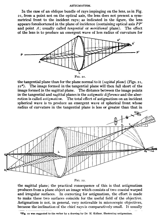 앞에서 언급한 "난시-비점 수차-/Astigmatism"는 흔히 사람의 시각과 관련한 '난시'와 조금 다르다. 우리 눈의 난시 증상은 수정체의 형태 이상-구면의 비대칭- 또는 수정체가 축에서 어긋나는 등의 이유로 망막 결상에서의 문제로 흐릿하게 보이는 경우를 칭하지만, 광축에 대칭된 구면 광학계에서 난시는 '(광축에서 멀리 떨어진 물체의 상이) 광학계를 통과한 후 수직과 수평에서 결상이 한 점에 수렴하지 못하는 (시상과 가로 광축을 따라 서로 다른 거리에 초점을 형성) 상태'를 말한다. 좀 더 설명을 보태면, 렌즈의 구성요소가 제자리를 이탈해서 광축에서 어긋나서 결상이 흐릿한 등등의 경우도 상이 한 점에 모이지 못하므로 모두 통칭하여 '난시'라고 할 수 있지만, 일반적인 구면 광학계(렌즈)에서 '난시/비점 수차'는 제한적인 의미로 사용한다고 생각한다.