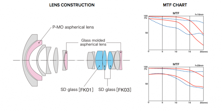 위 광학 설계는 이 렌즈의 새 버전인 Tokina 16-28mm f/2.8 Opera의 것이지만, 외부의 디자인 일부만 변경되었을 뿐 광학 디자인은 동일하므로 참고용으로는 문제없지 싶다.
