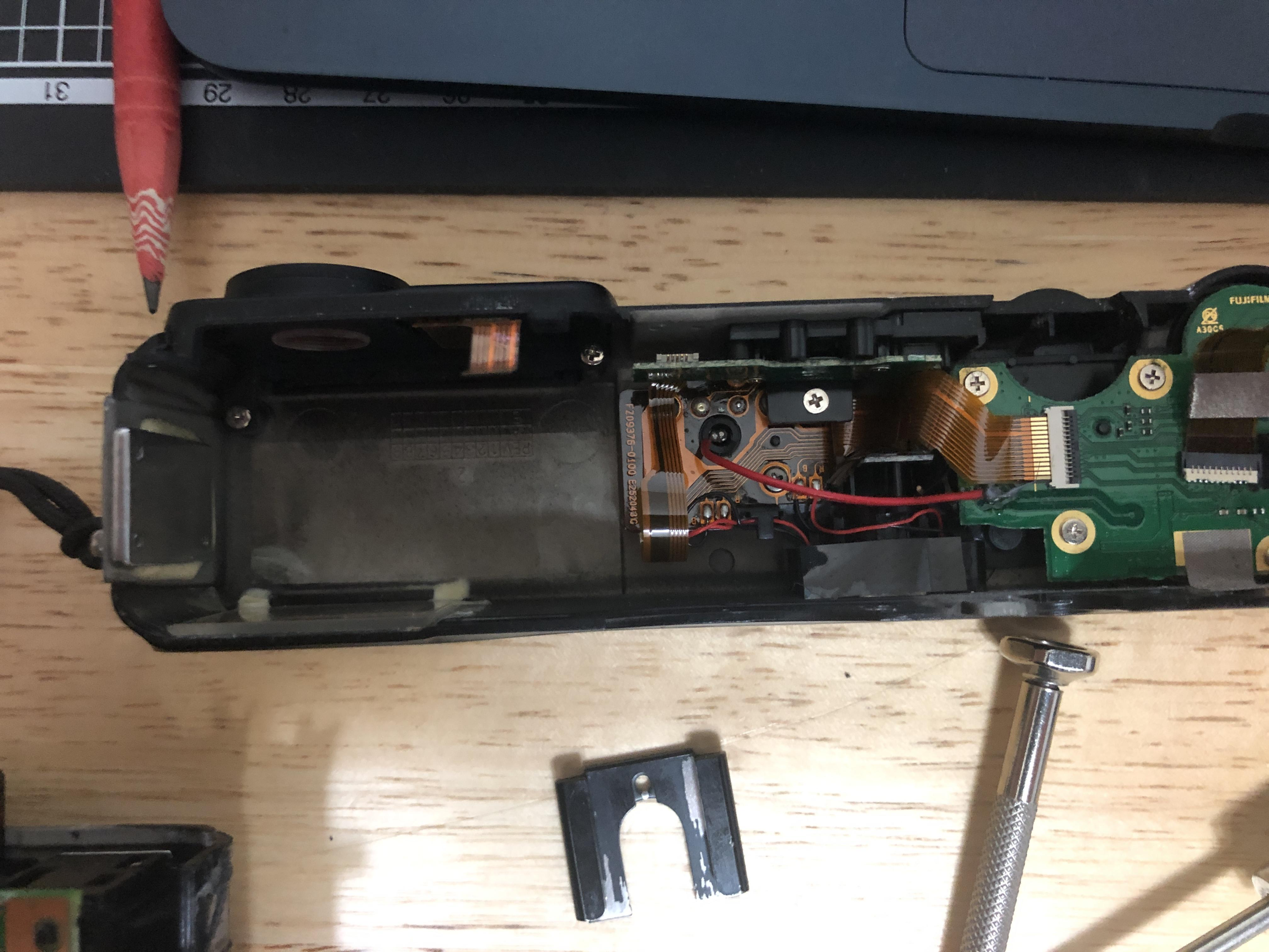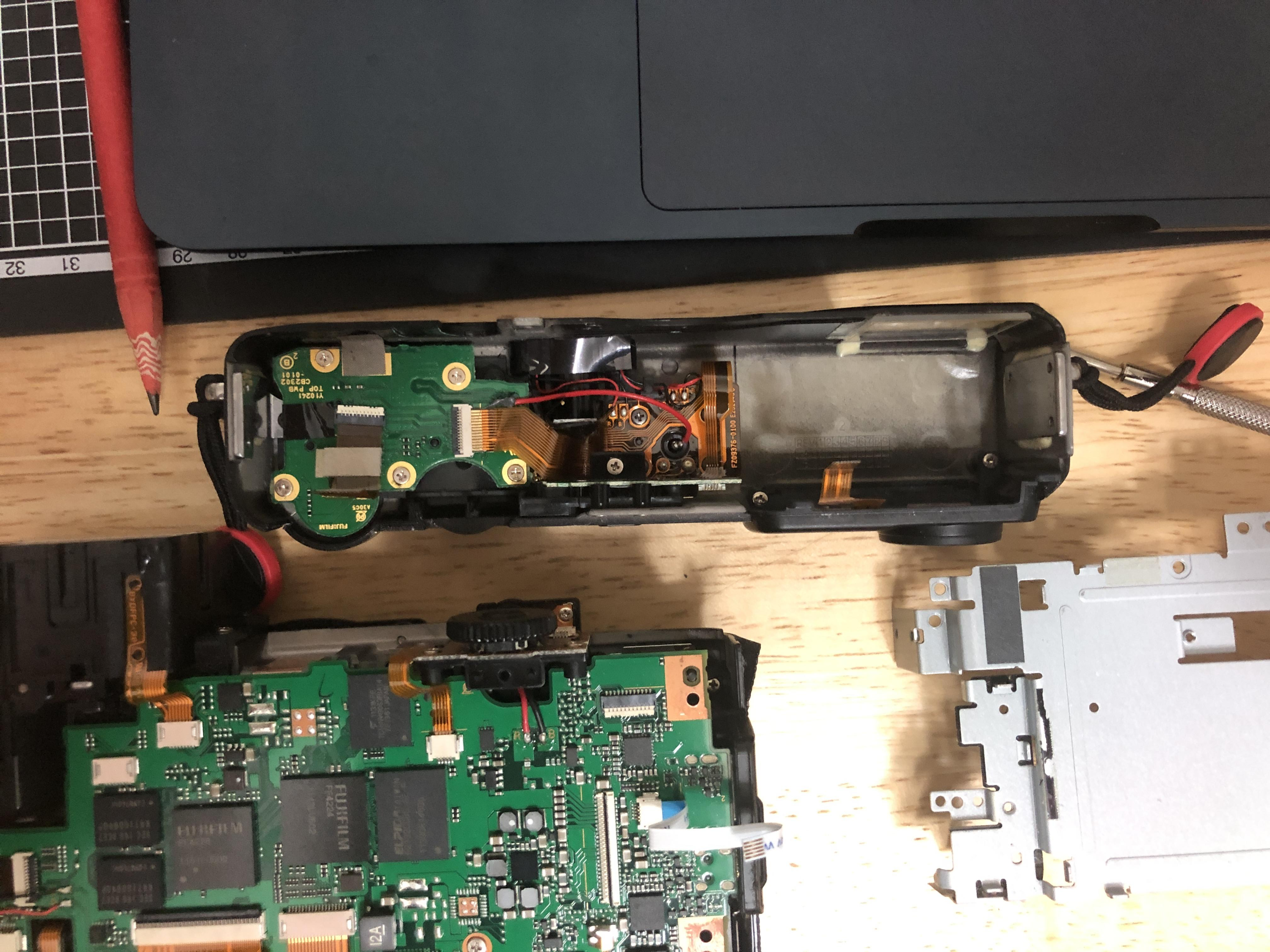 대략 분해 순서는 후면 외장 하우징을 제거하고, 후면 디스플레이(LCD) 제거 후, 내부 고정용 어셈블리를 제거한 상태다. 카메라 메인 보드와 상부 하우징의 조작부를 연결한 리본 케이블 두 개를 분리하면 상부가 분리된다.