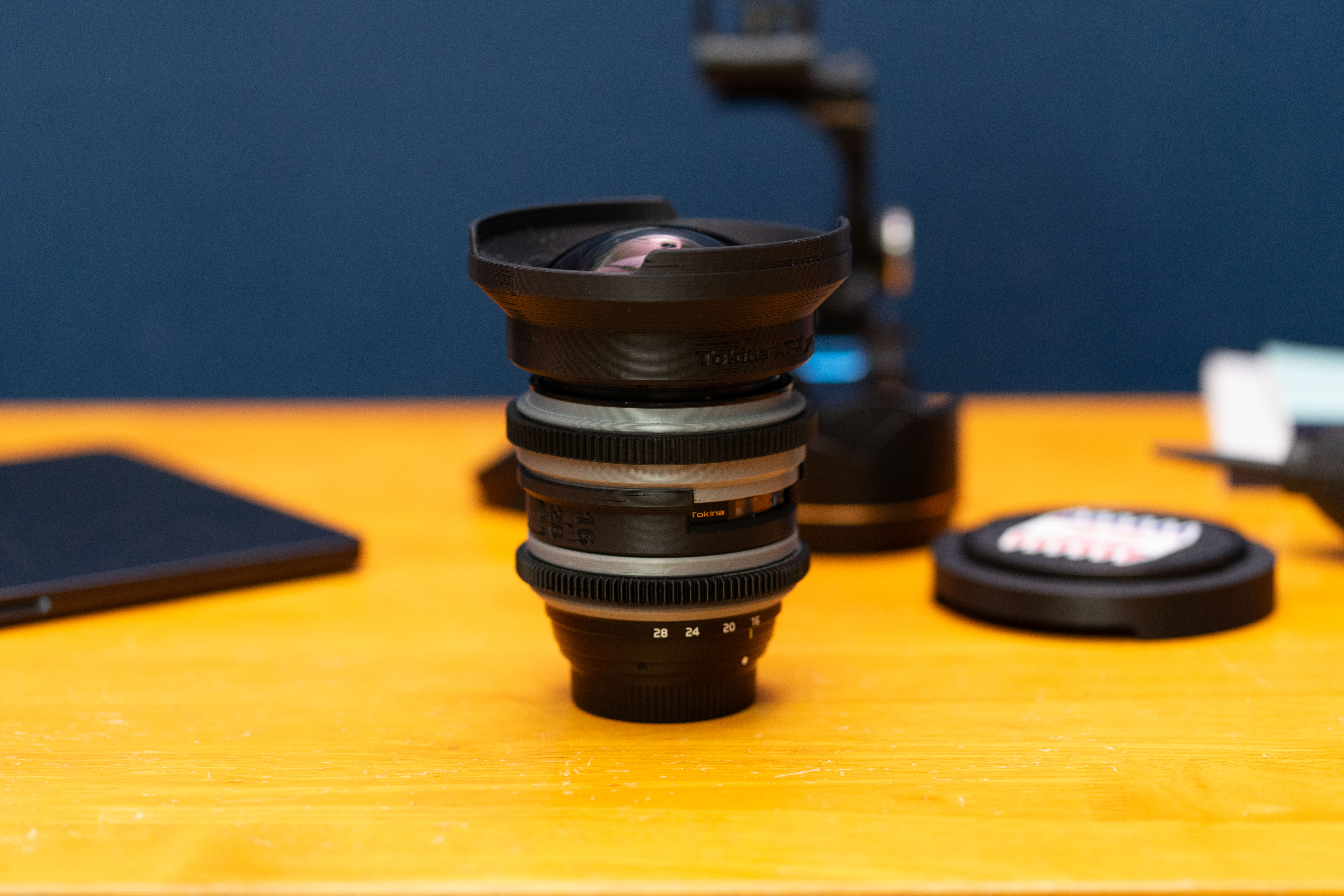 렌즈의 본래의 하우징이나 세부 파츠를 그대로 유지하고 외부에 부착하는 비파괴? 방식을 선호하지만, 전면 후드 부분은 부득이하게 분해 후 제거할 수밖에 없었다. 전면의 볼록 튀어나온 구면유리 탓에 이를 보호하기 위한 전면 하우징 형상을 유지하며 초광각(16mm)에서 비네팅이 발생하지 않게 하기 위해서는 외경 114mm로 디자인해야 했다. 하우징 업그레이드를 위해 여러 제약이 많은 고약한? 렌즈다. 16mm 초점거리에서 비네팅 발생하지 않는 선의 필터 장착을 위해 114mm 장착용의 매트박스와 4x5.65 규격의 사각 필터를 권장한다.