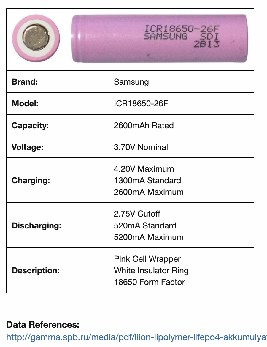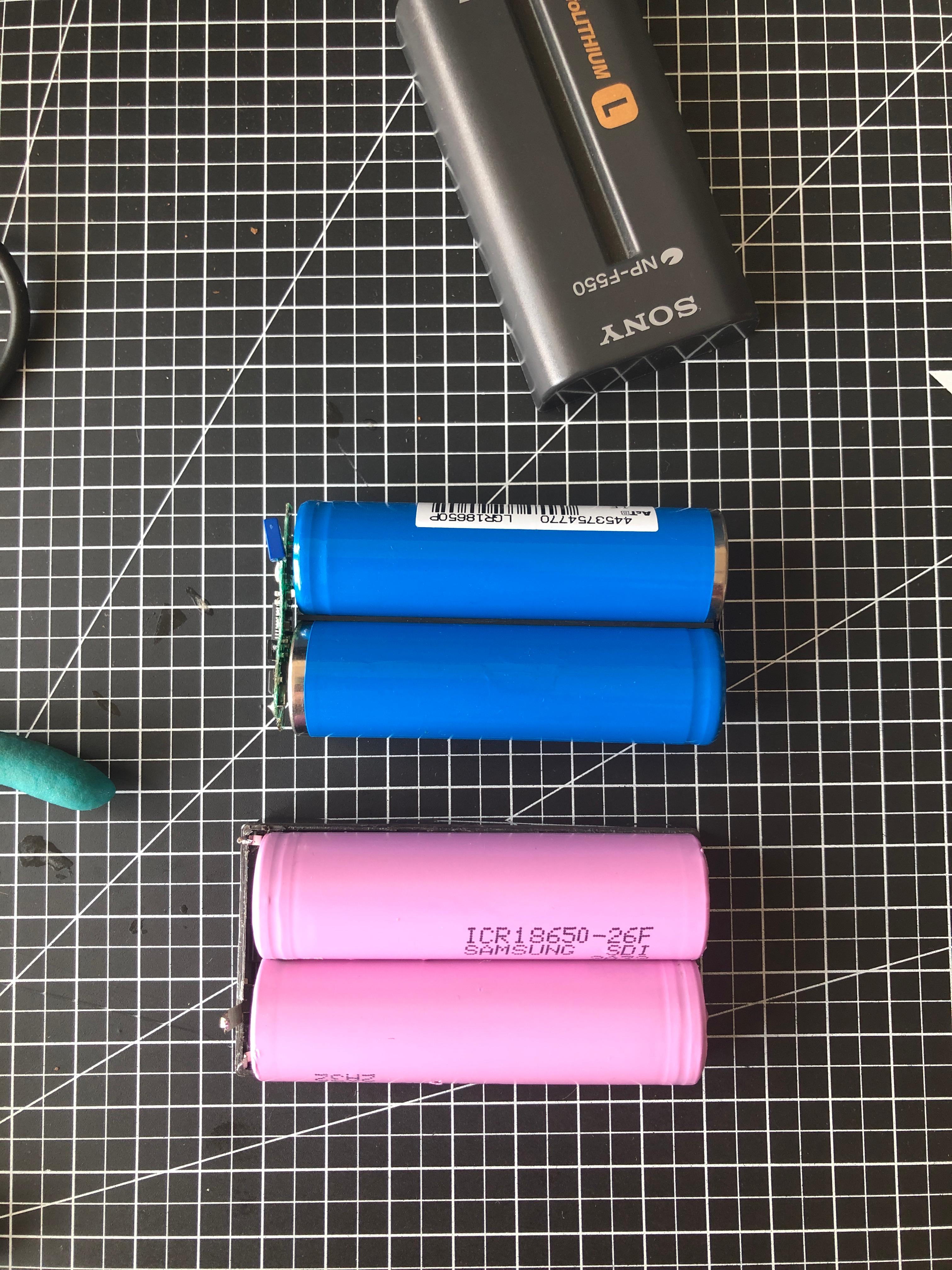 NP-F550에 있던 기존 18650 배터리 셀의 정보를 검색해 보니, 용량 1650mAh의 도시바 셀이다. 완충에서 각각 셀의 전압이 3.7V 정도이고, 정상적인 셀의 4.2v에 한참 못 미친다. 교체할 셀은 2600mAh 용량의 삼성 18650 셀(ICR18650-26F)을 준비했다. 최대 출력 전류가 5.2A인 일반 방전율 사양이며, 사용 빈도가 낮았던 노트북 배터리에서 추출한 것으로 완충에서 4.18V 수준이므로 새 배터리의 90% 성능 정도를 예상한다. 정밀한 용량 성능 측정을 위해서 방전량 측정이 필요하겠다. 관련 장비가 없어 추정치로 대신하자. 충전 용량은 기존 1650mAh x 2에서 2600mAh x 2로 약 1.6배 정도로 예상하며 (기존 NP-F550에 비해) "힘세고 오래가는 배터리"로 거듭나길 기대할 수 있겠다. (정품 NP-F550 용량 10.8Wh에서 약 18Wh로 늘어날 것으로 추정, 정품 NP-F570은 2400mAh 셀 2개로 구성, 용량은 15.8Wh)