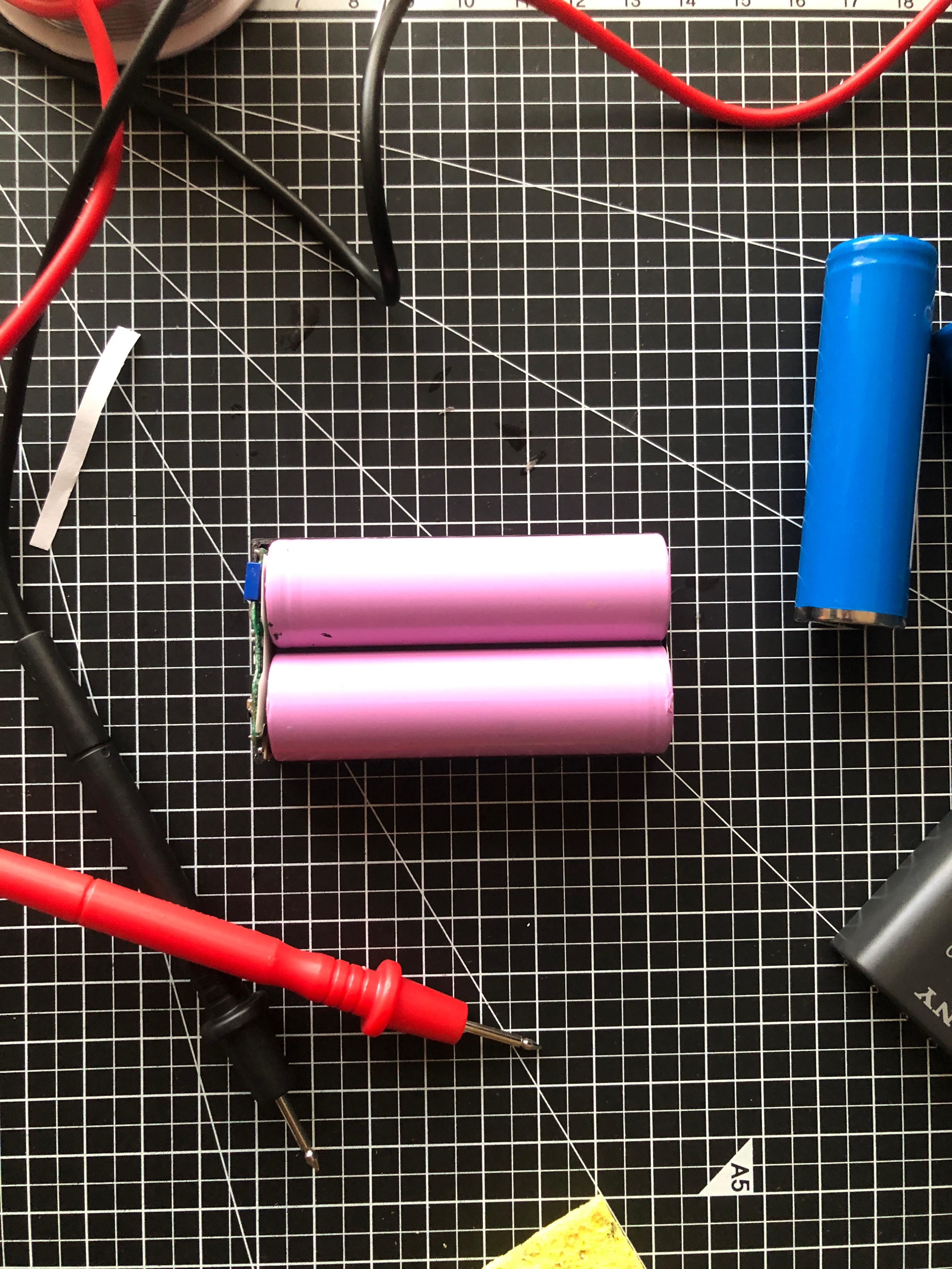 스폿 접합의 구겨진 니켈 부분은 고무망치와 모루?를 이용해서 다시 폈고, 배터리 직렬 연결을 위한 하부 +/-와 두 셀의 밸런싱을 위한 B1 연결용 가늘고 긴 니켈 선을 교체한 배터리 셀 하단에 스폿 용접하고 다른 쪽은 보호회로 연결부와 납땜했다. 이후 분해의 역순으로 교체된 배터리의 +/- 에 맞춰 셀과 보호회로(PCM)를 연결하고, 인두기로 분해 작업했던 하부 하우징에 있는 외부 입출력 +/- 와 데이터 연결 접점과 보호회로의 단자를 인두기로 납땜해서 원래 상태로 재조립!