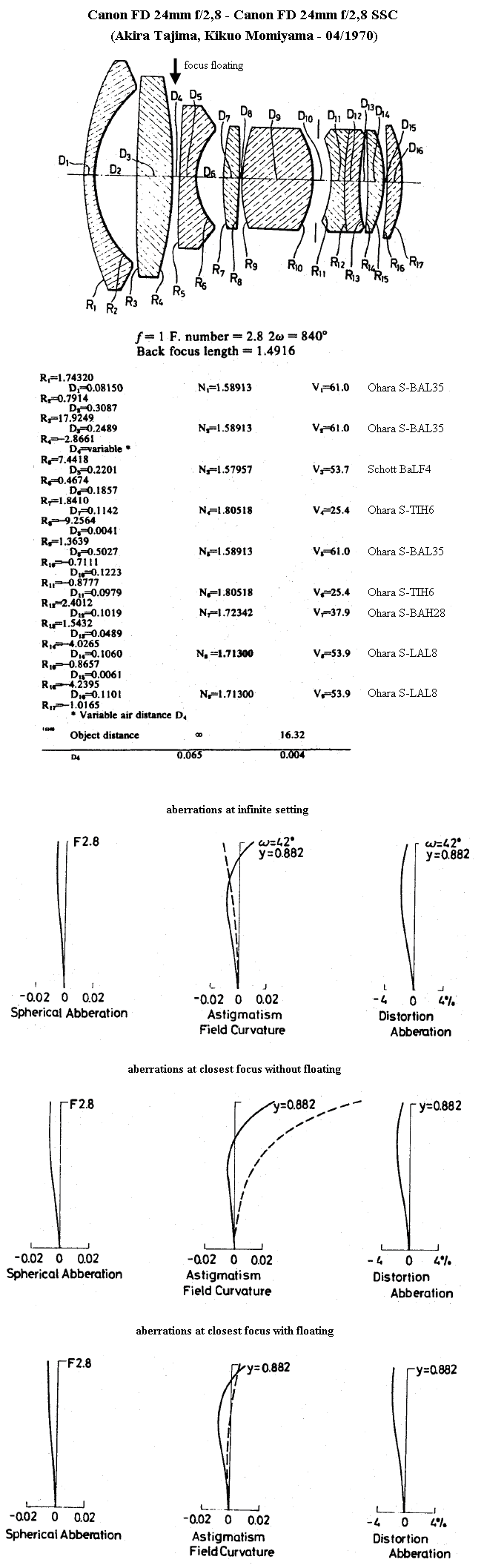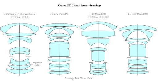 캐논 FD와 nFD 렌즈는 광학 구성에서 거의 비슷한 광학 구성인 경우도 흔하지만, Canon FD 24mm f/2.4 S.S.C와 Canon nFD 24mm f/2.8은 광학 구성/설계가 다르다.(아래 이미지 참조) 플로팅 요소 시스템은 계속 적용되었다.