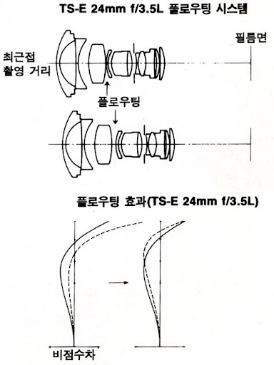 "기존 광학계 전체가 이동해서 초점을 맞추는 방식은 포커싱 변화에 따라 수차가 커지는 문제에 대응하기 어렵고, '레트로 포커스 타입'의 광각 설계는 근경에서(포커스 거리가 짧아질수록) 난시/비점 수차(astigmatism)가 증가하는데, 이에 대한 해법으로 플로팅 메커니즘이 적용되었다. 당시 캐논에서 "최소 근경 피사체부터 무한대까지 모두 선명한 이미지 표현"이란 문구로 홍보했다."