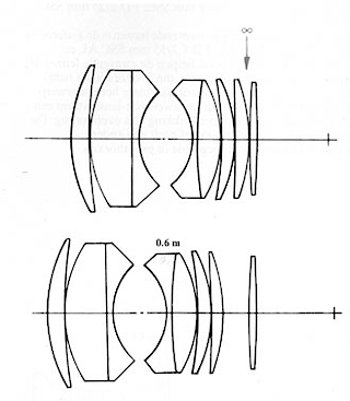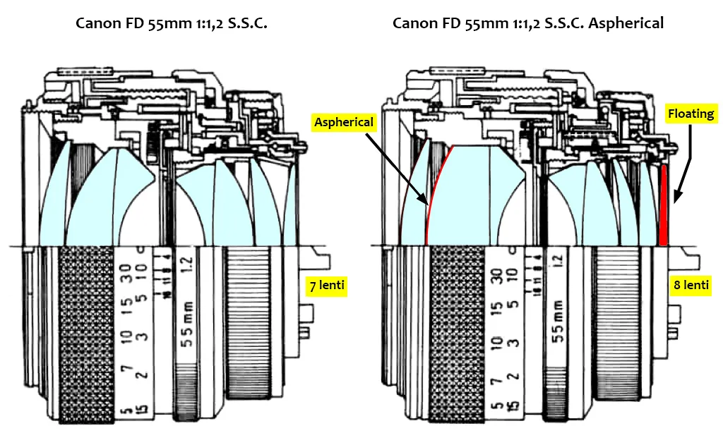 55mm 초고속 렌즈 또한 포커스 링 조작에 따라 광학계 전체가 이동하는 방식이었고, 근경 포커스에서 수차 증대 문제에 대응하기 위해서 FD 55mm f/1.2 AL (Aspherical) 버전에 8번째 플로팅 요소를 추가하여 6군 8매의 구성이다. 플로팅 요소의 작동 방식은 아주 단순했는데, 8번째 요소는 포커스 이동에 관계없이 렌즈 후방에 고정되어 있고, 그 외 요소 그룹은 포커스에 따라 앞뒤로 움직인다. 즉, 8번째 요소와 다른 요소그룹 사이 간격이 포커스 이동에 따라 달라지며 근거리 수차를 보정한다. (상단 우측 이미지 참조)